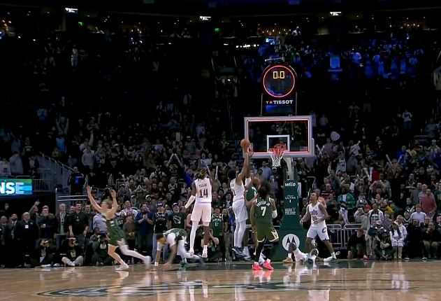 第四节比赛中,贾勒特-阿伦最后时刻补篮绝平,裁判回看判定超时无效