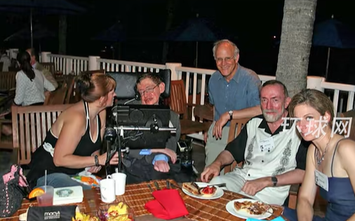 照片中斯蒂芬·霍金面带微笑躺在日光浴床上,两侧各站着一位身着比基尼女性。