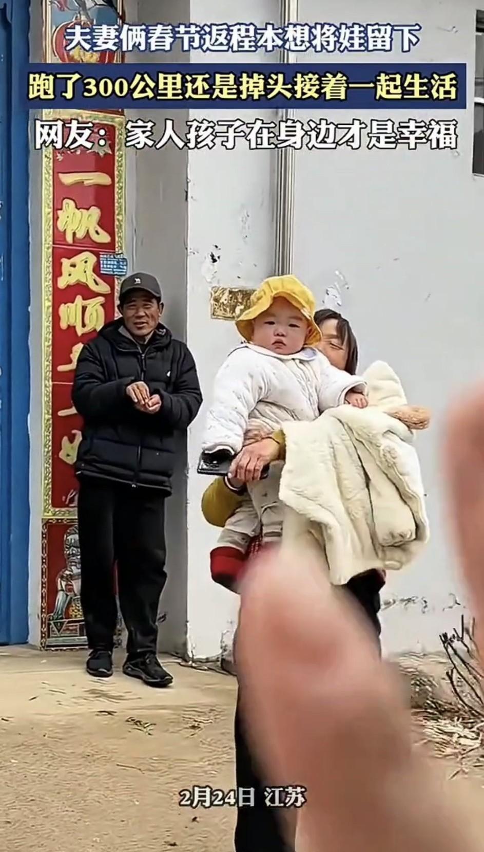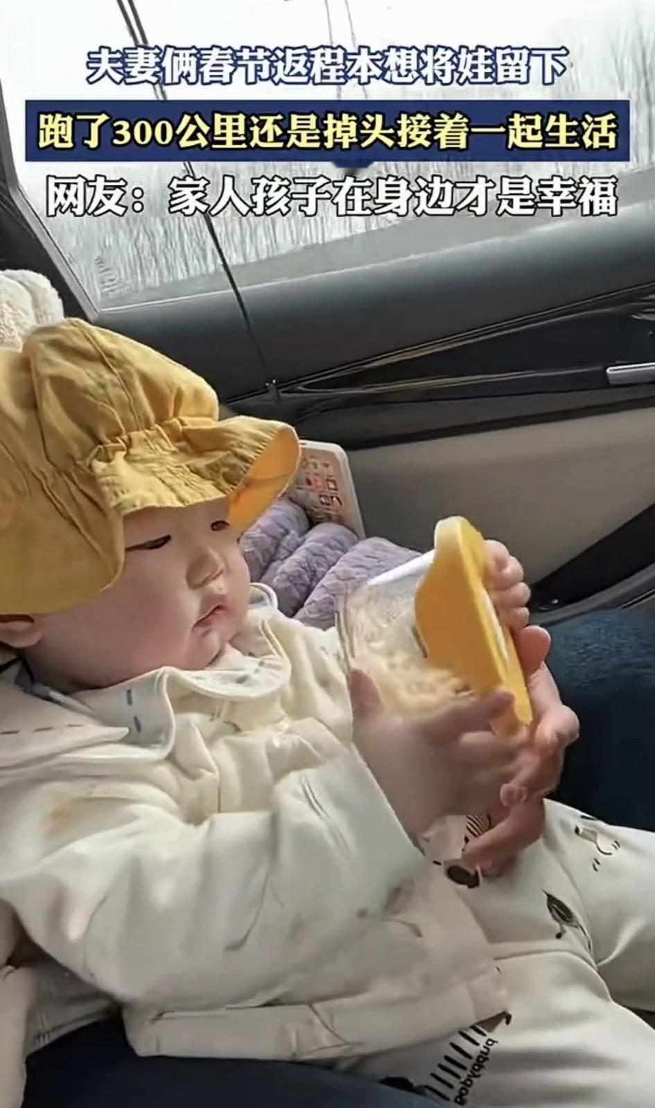 江苏,一妈妈春节假期结束后将要返程,可身边还有个十个月大的宝宝需要人照顾,考虑着孩子带在身边不方便工作,于是夫妻俩便决定把孩子留在老家交给爷爷奶奶带。可返程途中妈妈又开始纠结了起来,最后跑了三百公里后,妈妈还是选择了掉头,把孩子接走带在自己身边。 视频可见,妈妈走时就对孩子依依不舍,之后选择掉头回家将孩子带上后,妈妈心里明显舒坦了许多,看着孩子乖乖的坐在她的身边时,妈妈也终于安心了。 对此有网友就表示:妈妈做的选择没毛病,做为过来人真心告诉你,再苦再累都要把孩子带在身边,留守儿童缺少父母的关爱,真的会受到影响,还会与父母感情淡薄。 还有网友表示:为了带孩子,我是直接辞去事业单位工作,但很多人都说我傻,其实我也不知道自己傻不傻,可为了带好孩子我也管不了那么多了。 也有网友表示:如果条件允许,哪怕艰苦,还是要尽可能的带在自己身边。我这辈子最后悔的就是把我的3岁小孩留在了老家。哎,还是应该自己带,哪怕苦点累点,以前不懂,懂的时候娃娃长大了,但却错过了很多和孩子在一起的时光,很后悔当初的决定。 不得不说,这个妈妈做了很多妈妈想做,却又不敢做的决定。但接到孩子那一瞬间,妈妈一定是开心很欣慰,因为只要家人孩子能在身边,再苦再累也会很幸福! 正如网友所说,成年人为了生活没有容易二字,但人生图个啥,无非就是家人和孩子能在身边。或许孩子放在老家让父母带,自己能省心很多,但转念一想,如果孩子带在身边,作为父母也能把孩子带得好好的吧。总之,别让自己和孩子这短短几十年的相处,留下太多遗憾了。 对此大家怎么看?