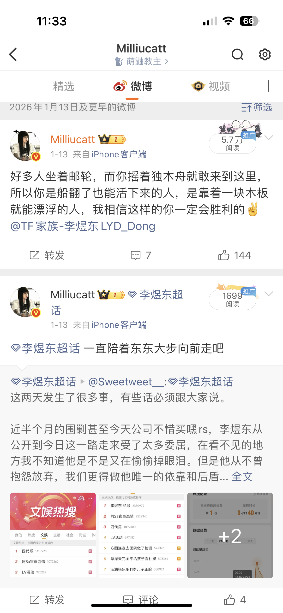 细数追李煜东的5个月以来,我真正崩溃的只有1月13号。空降的黑rs一个小时就直升榜一,大量yxh的突然下场,gs的冷眼旁观、目睹李煜东作为旗下的wcn艺人遭受大体量的网暴却丝毫不作为,tss的冷嘲热讽还有落井下石…最好笑的是那天某家粉丝说他是皇子,sdfj给他花大价钱买黑rs就是为了给他澄清造势…但东毛们声嘶力竭的维权却什么也没等来,等来的只有大家一晚上不敢闭眼的手动降rs和ct里面举也举不完的wb。还记得那天晚上东东下班,所有人都在喊李煜东你最棒,东毛看到路透里东东听到这句话笑起来的眼睛全都崩溃的泣不成声。连被tss说是给皇子的大舌头cha,也是黑rs那天拍的给他的补偿。我还是那句话,好多人坐着邮轮,而你摇着独木舟就敢来到这里,所以你是船翻了也能活下来的人,是靠着一块木板就能漂浮的人,我相信这样的你一定会胜利的