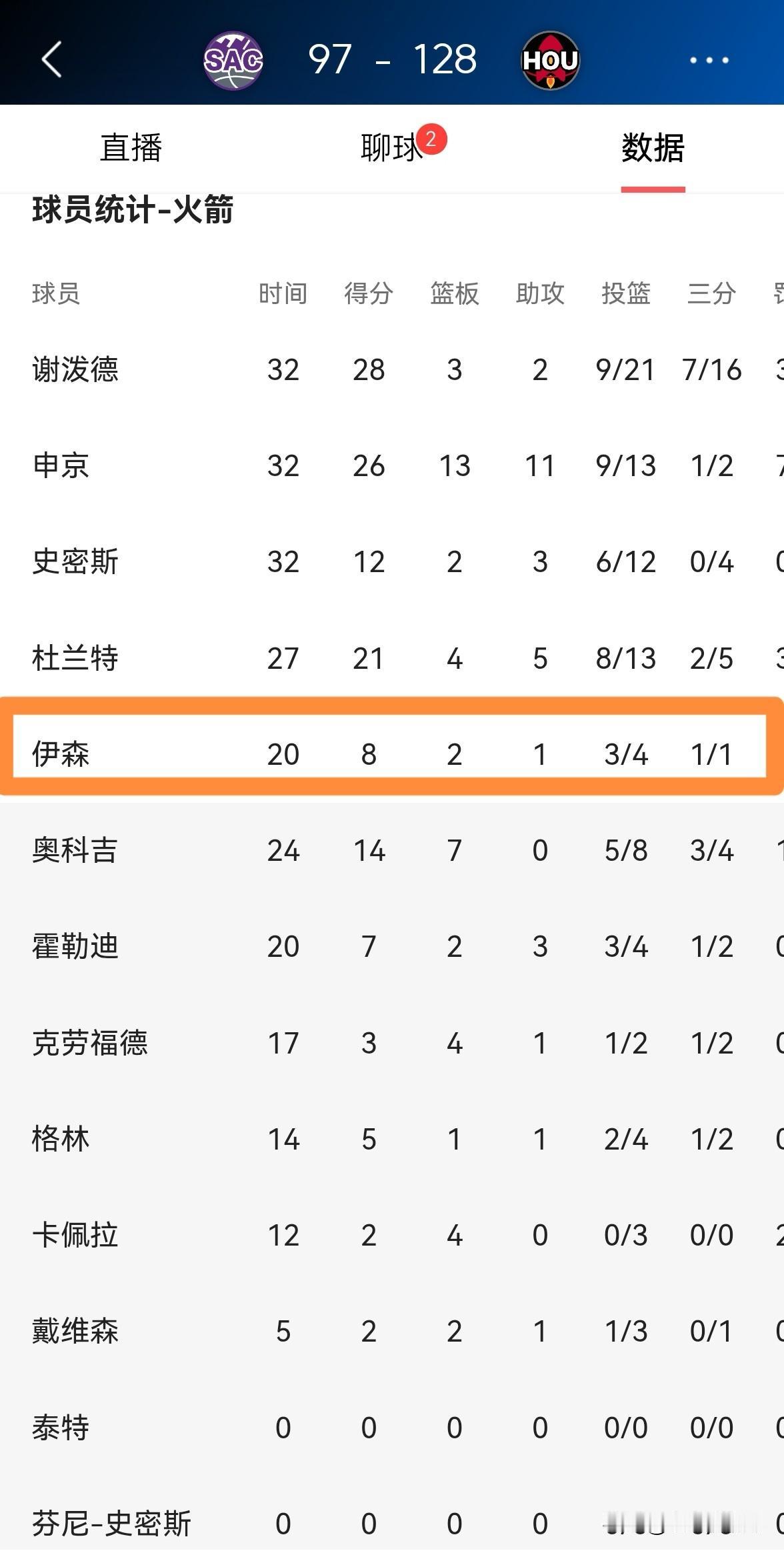 火箭大将伊森真是太暗淡无光了!虽然今天火箭在主场以128:97大胜国王,但是伊森的表现并不十分的出彩,他成为了球队阵中最黯淡无光的球员之一。 全场比赛下来,伊森首发出战20分钟,投篮4中3,其中三分球1中1、罚球1中1得到8分2篮板1助攻1抢断1盖帽,还有4次犯规,他的场上正负值为全队第二低的+2。