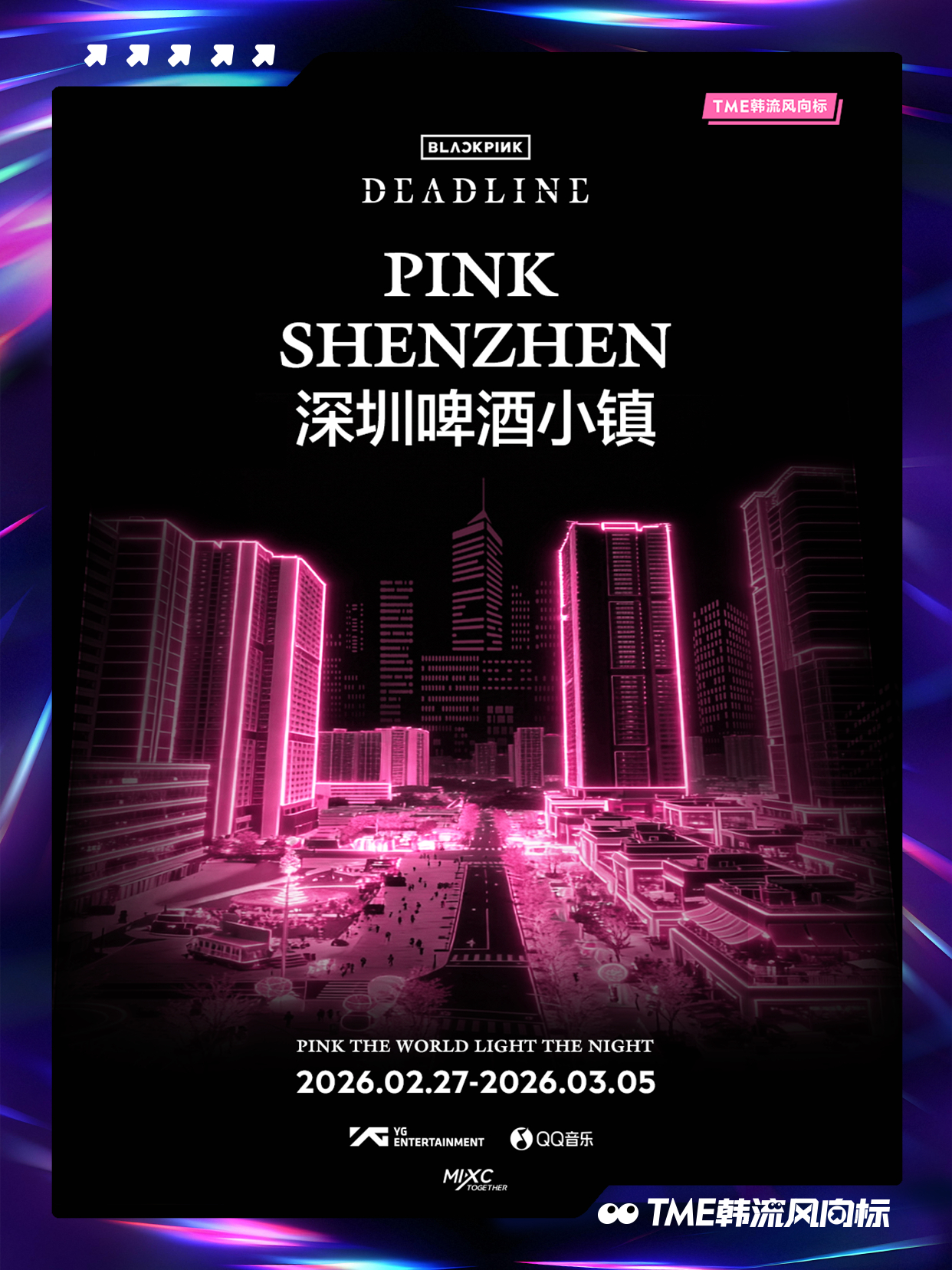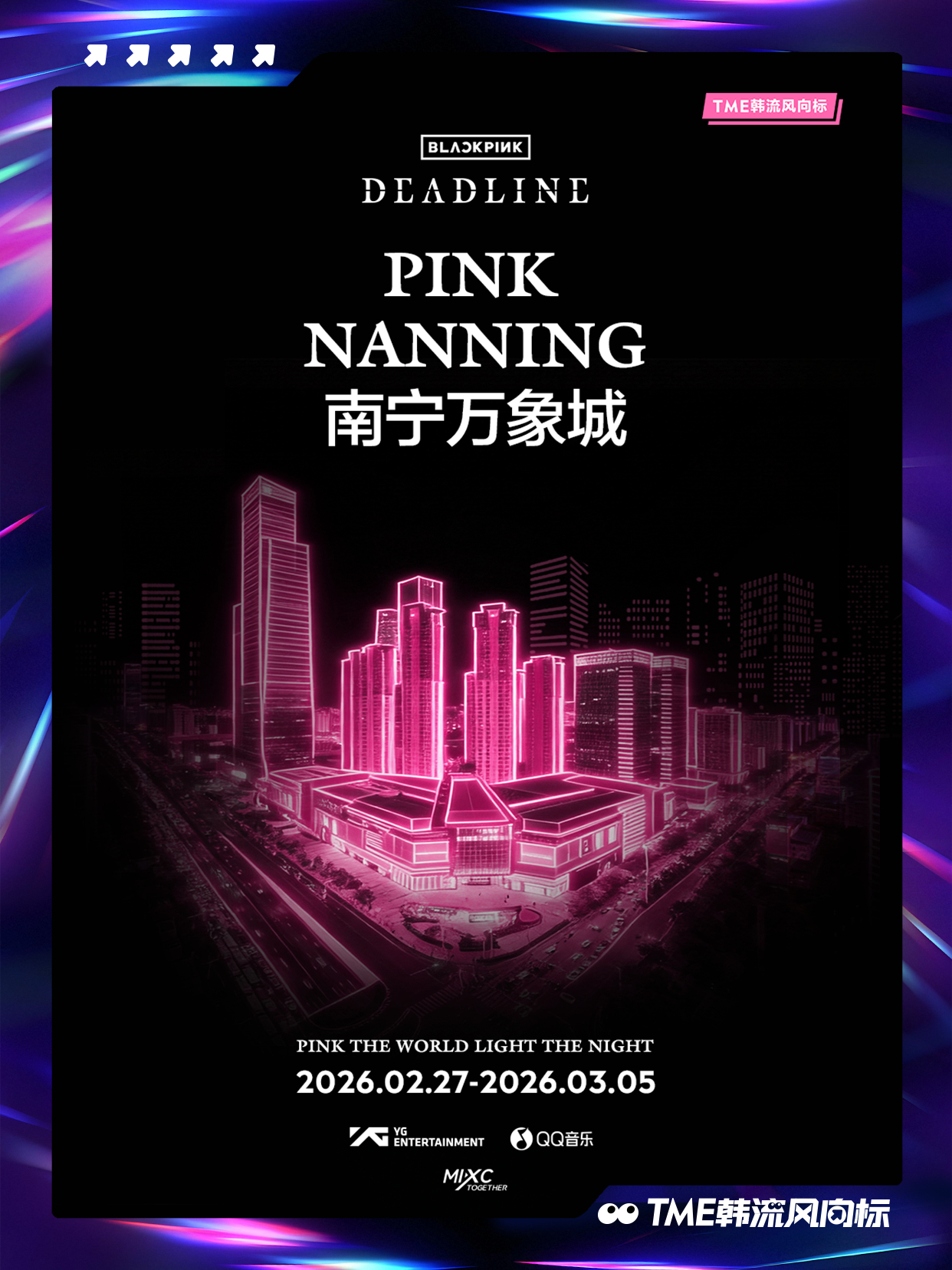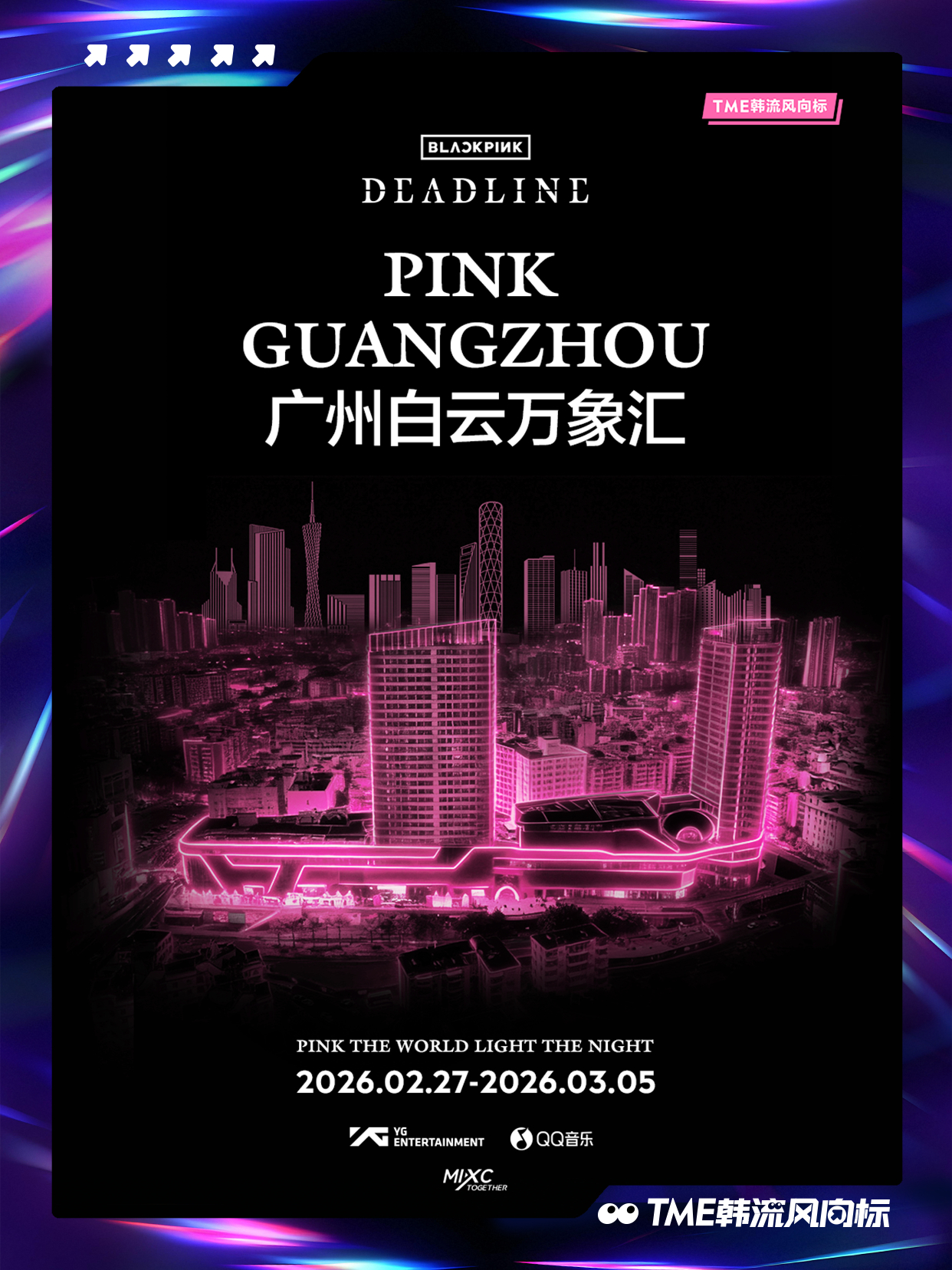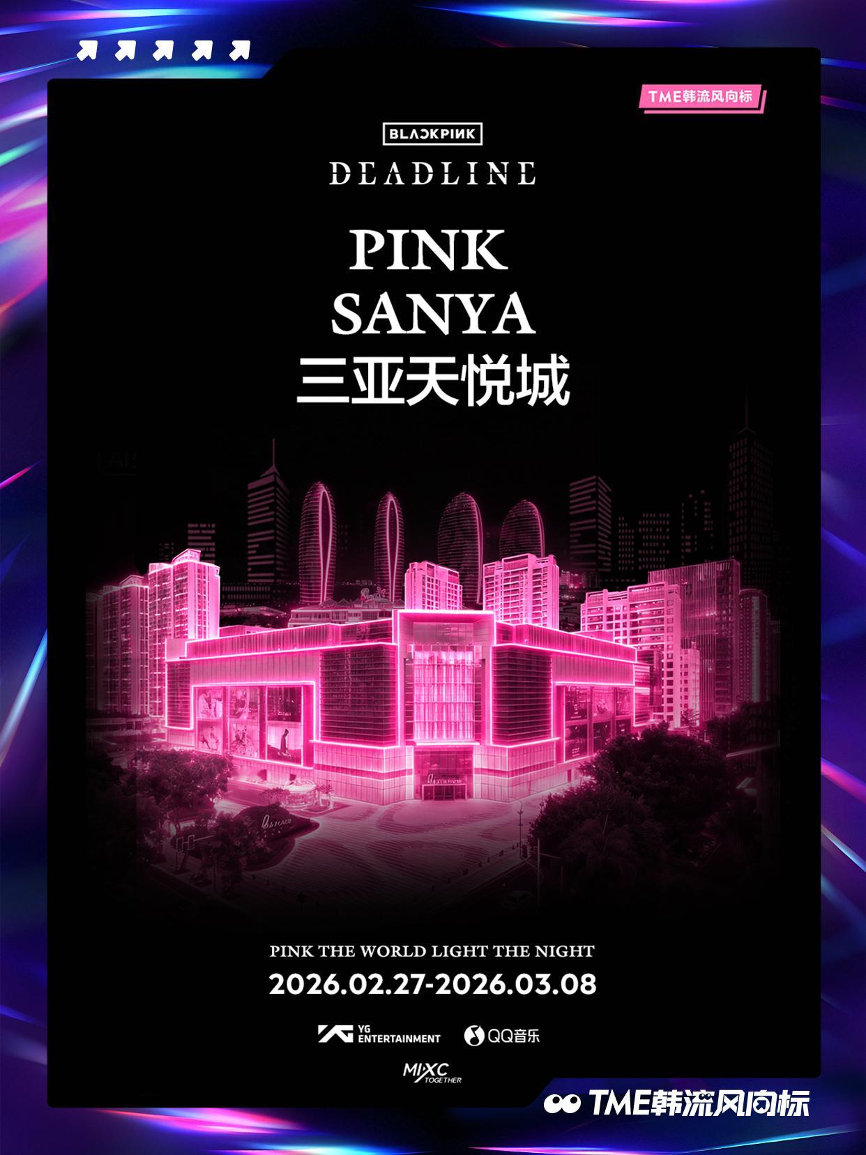 BLACKPINK BLACKPINK 《DEADLINE》光之巡礼即将点亮!「PINK THE WORLD, LIGHT THE NIGHT」将登陆全国10城12座项目,以粉色之名重绘城市上空!2月27日起,跟随光的轨迹,走进这场《DEADLINE》光之巡礼,请寻找你身边的粉色光源,共同见证并记录这场盛大点亮!点亮BLACKPINK粉色夜晚📍打卡坐标1、广州白云万象汇:户外400米长廊粉色极光2、深圳万象前海:“前海之翼”天幕灯光3、深圳啤酒小镇:雪花大厦粉色泛光4、深圳湾万象城:Wave广场、白色魔方亮灯5、澳门巴黎人:巴黎人铁塔6、厦门磐基中心:160米楼体外立面走字屏7、宁波万象城:摩天轮城市光影效果8、南宁万象城:150米外广场粉色树灯长廊9、三亚天悦城:六层楼全楼亮灯10、佛山顺德万象汇:200米空中长廊粉色亮灯11、东莞松山湖万象汇:高街2000平方米粉色极光12、中山石岐万象汇:中山第一高楼粉色亮灯