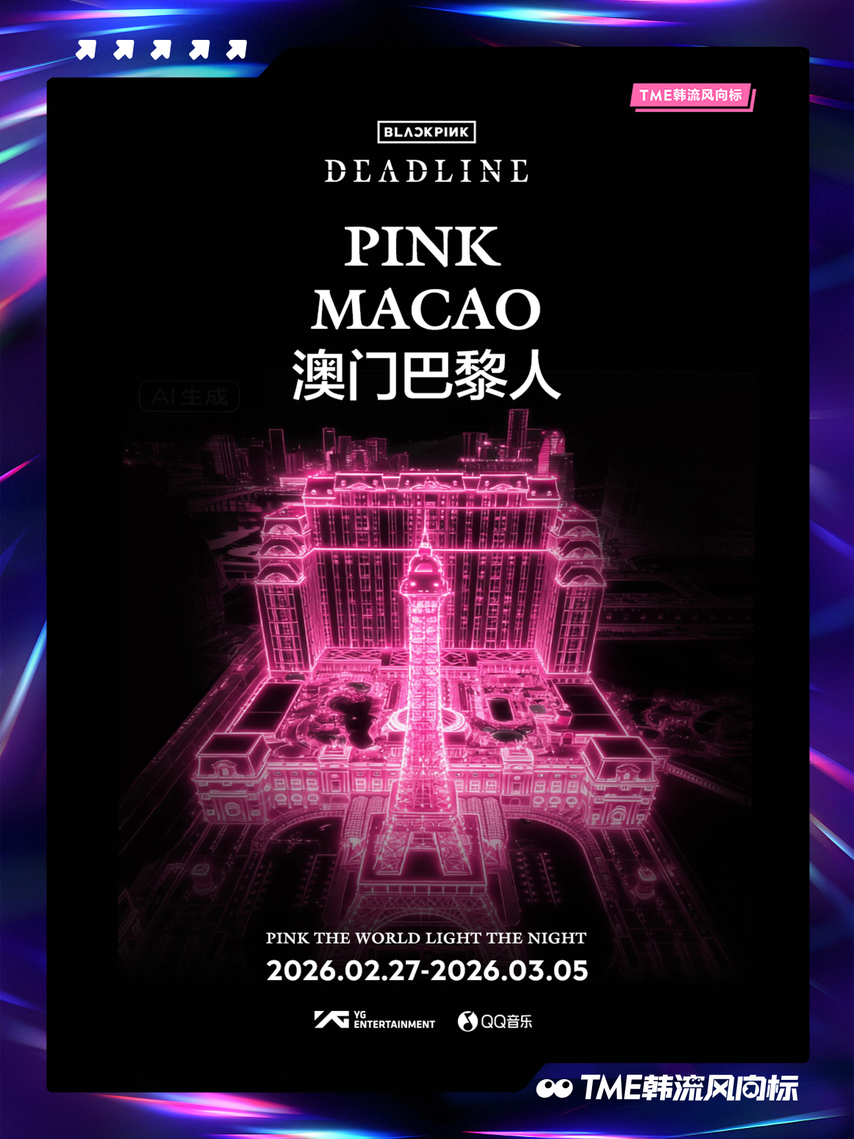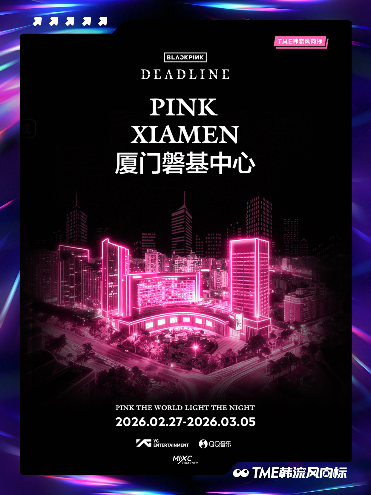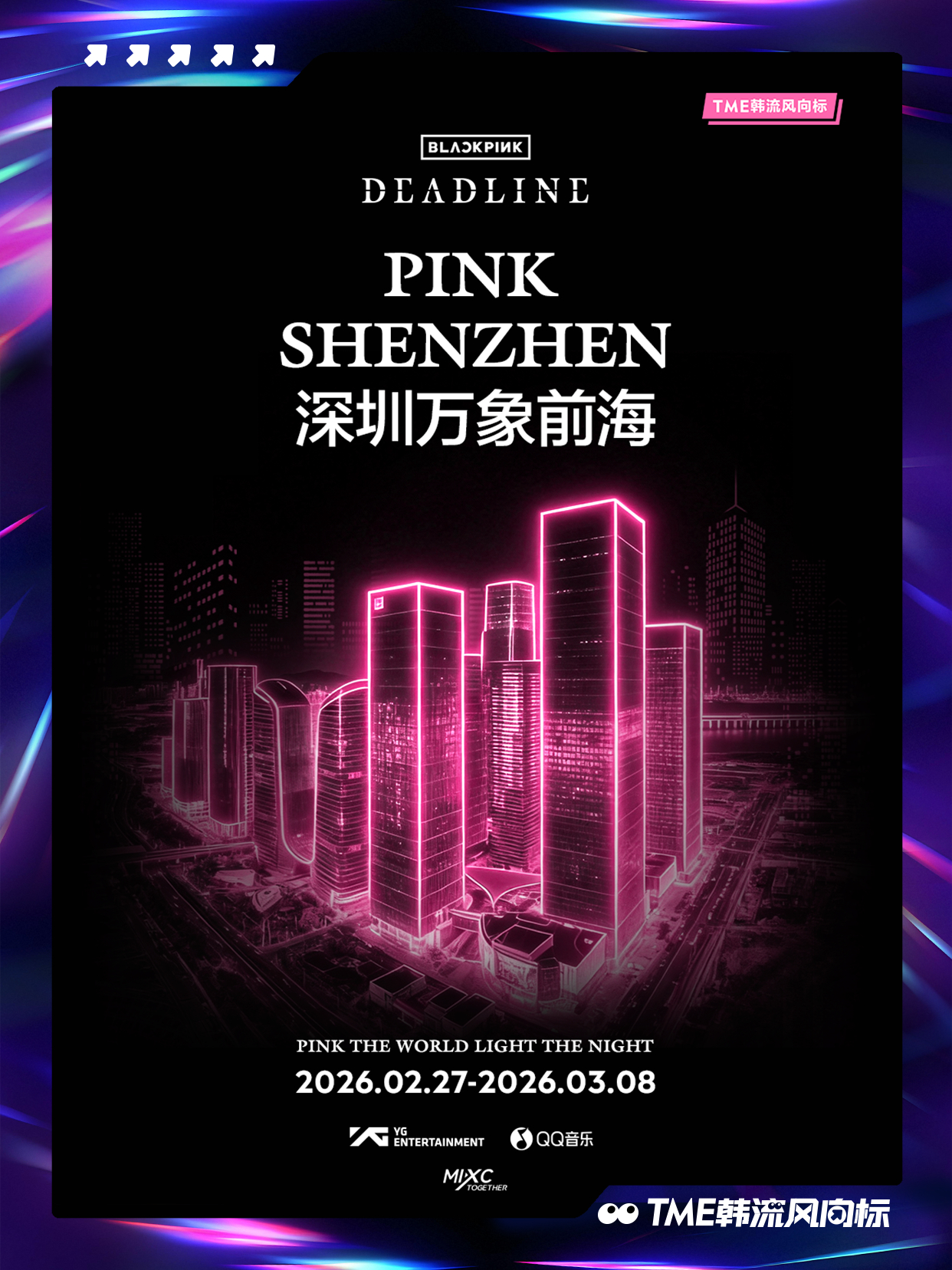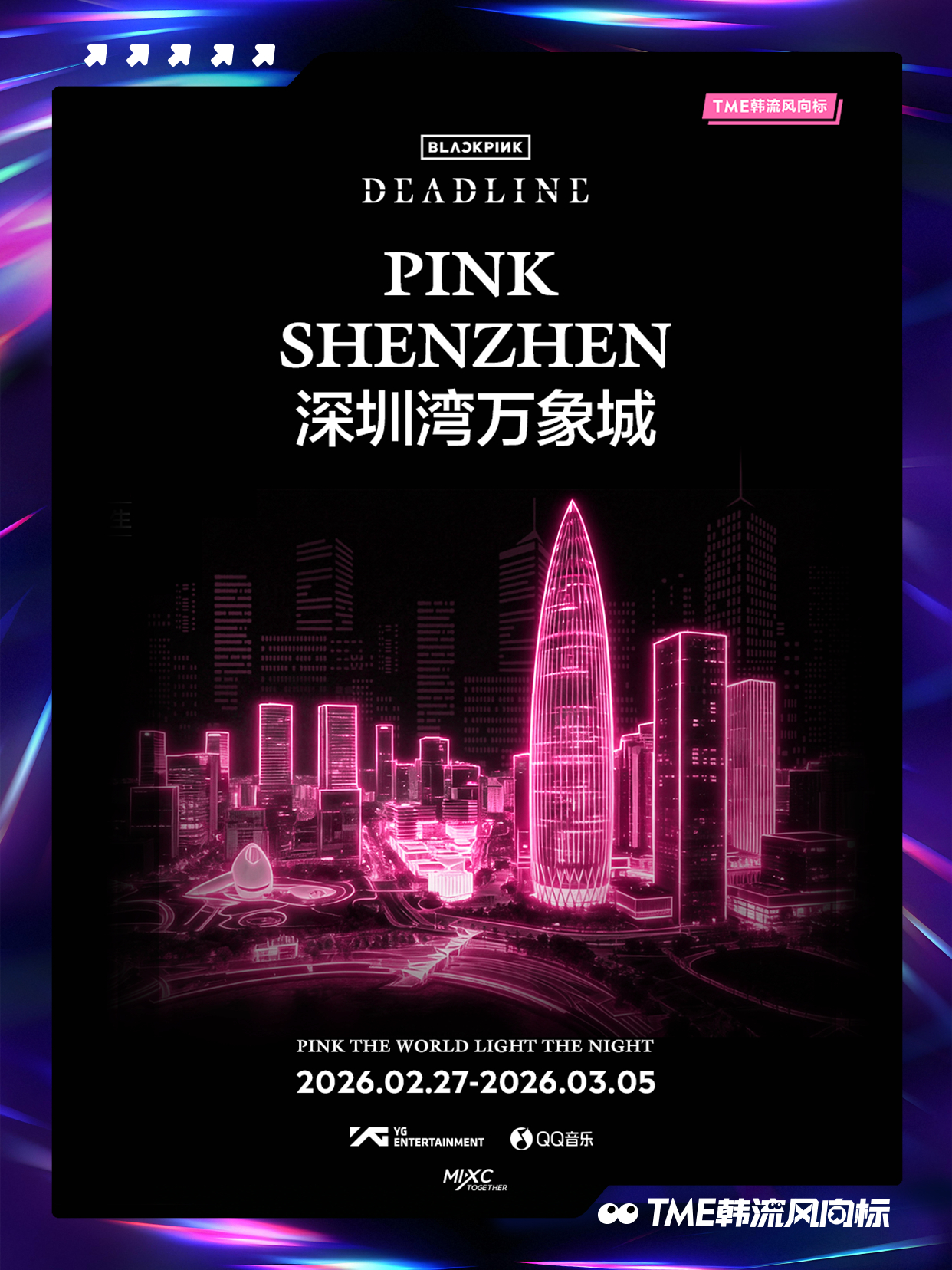 BLACKPINK BLACKPINK 《DEADLINE》光之巡礼即将点亮!「PINK THE WORLD, LIGHT THE NIGHT」将登陆全国10城12座项目,以粉色之名重绘城市上空!2月27日起,跟随光的轨迹,走进这场《DEADLINE》光之巡礼,请寻找你身边的粉色光源,共同见证并记录这场盛大点亮!点亮BLACKPINK粉色夜晚📍打卡坐标1、广州白云万象汇:户外400米长廊粉色极光2、深圳万象前海:“前海之翼”天幕灯光3、深圳啤酒小镇:雪花大厦粉色泛光4、深圳湾万象城:Wave广场、白色魔方亮灯5、澳门巴黎人:巴黎人铁塔6、厦门磐基中心:160米楼体外立面走字屏7、宁波万象城:摩天轮城市光影效果8、南宁万象城:150米外广场粉色树灯长廊9、三亚天悦城:六层楼全楼亮灯10、佛山顺德万象汇:200米空中长廊粉色亮灯11、东莞松山湖万象汇:高街2000平方米粉色极光12、中山石岐万象汇:中山第一高楼粉色亮灯