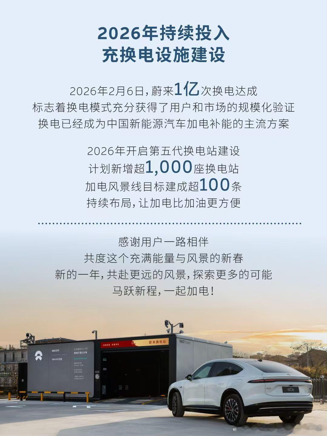 2026年2月6日,蔚来1亿次换电达成,标志着换电模式充分获得了用户和市场的规模化验证,换电已经成为中国新能源汽车加电补能的主流方案。
