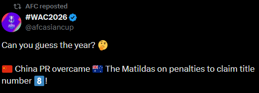 官方配文:猜猜这是哪一年?中国女足通过点球大战击败了澳大利亚,获得了第八座冠军奖杯。