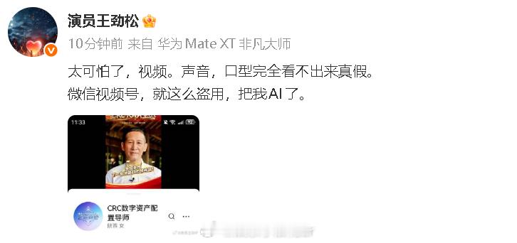 王劲松称被AI盗用王劲松怒斥被AI盗用 王劲松发文:“太可怕了,视频。声音,口型完全看不出来真假。微信视频号,就这么盗用,把我AI了。 ”