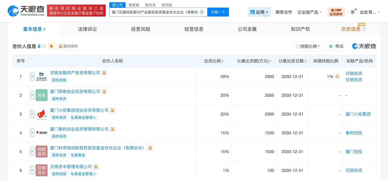 交银投资等在厦门成立新兴产业基金 出资额1亿 天眼查App显示,近日,厦门交融同