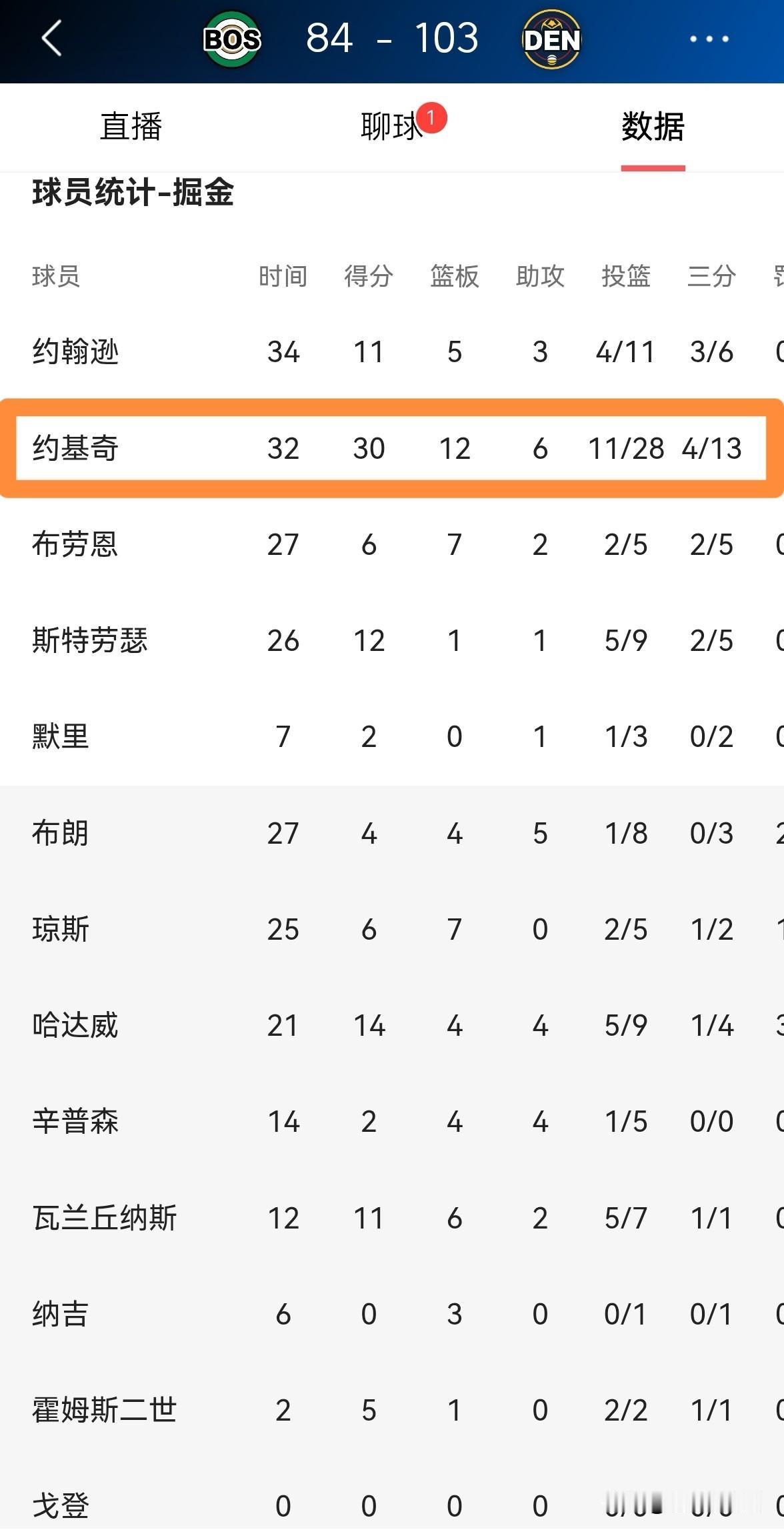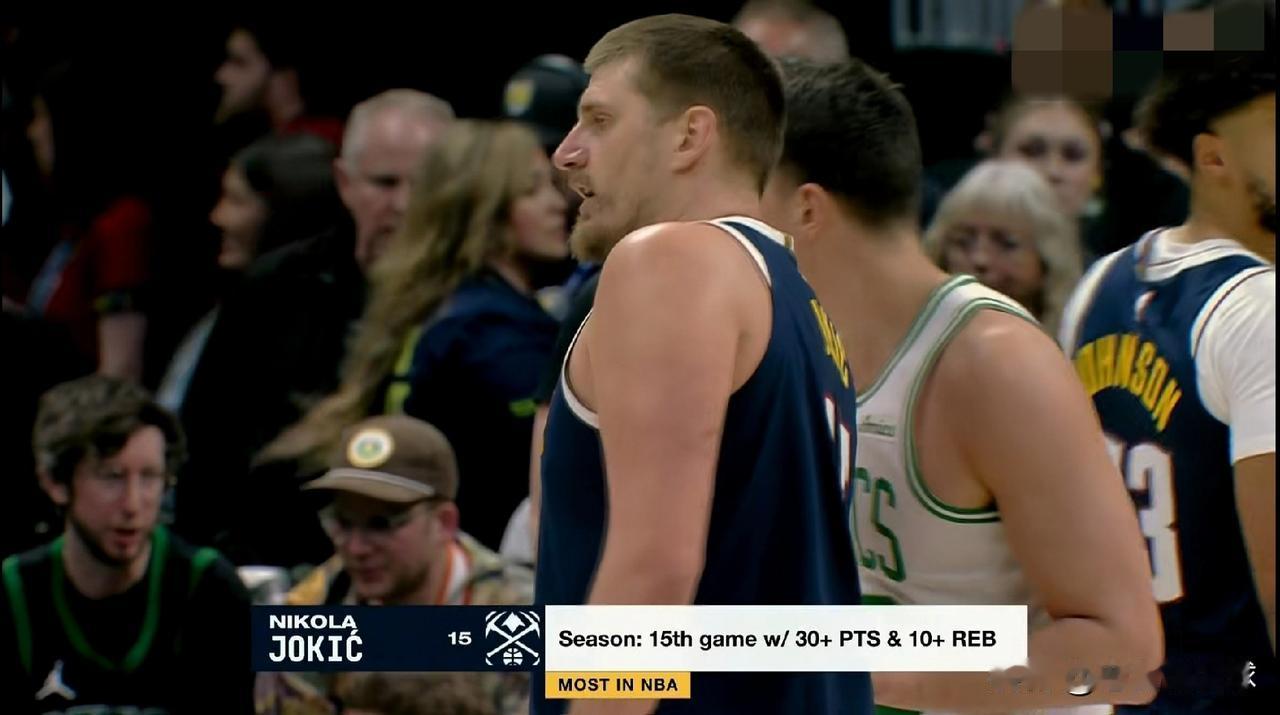 掘金超级巨星约基奇真是太猖狂了!在今天掘金主场以103:84大胜凯尔特人的比赛中,约基奇狂轰30分12篮板,成为了本赛季开赛至今单场比赛砍下至少30分10篮板场次最多的球员。 全场比赛下来,约基奇首发出战32分钟,投篮28中11,其中三分球13中4、罚球7中4轰下30分12篮板6助攻,他的场上正负值为+13。 坦白说,虽然约基奇时常被人嘲讽为一个数据刷子,但是约基奇确实是当今联盟实力最强的球员,他能够在穆雷因伤提前退赛的情况下击败实力强大的凯尔特人就是最好的证明。
