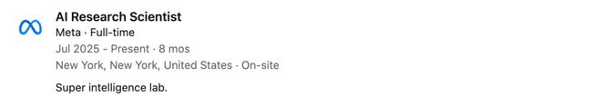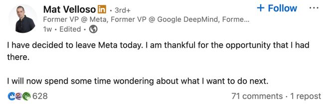 他于去年7月从谷歌DeepMind加入Meta的AI部门,并于上周在LinkedIn上宣布了离职消息。