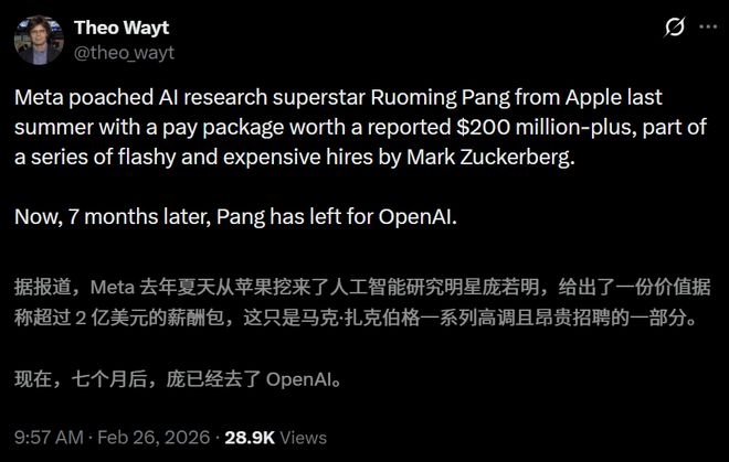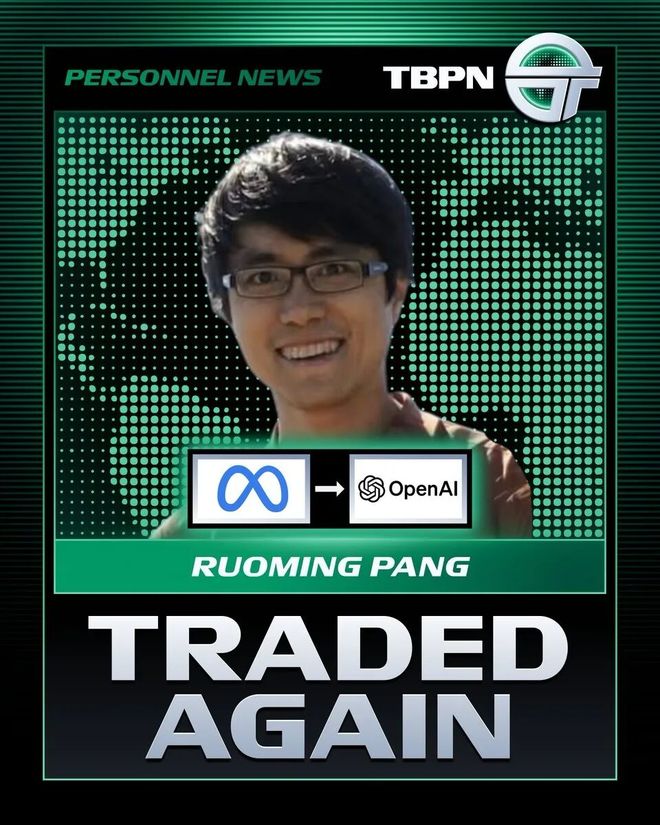 入职Meta「超级智能实验室」仅7个月,华人明星研究员庞若明(RuomingPang)转投OpenAI。