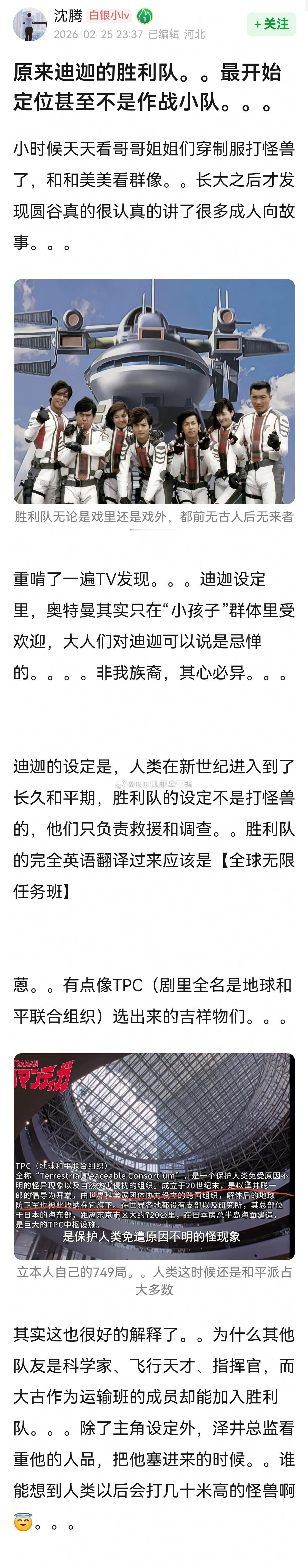 小时候就看过迪迦奥特曼,看了这个帖子才发现讲了很多成人向故事→原来迪迦的胜利队,最开始定位甚至不是作战小队~