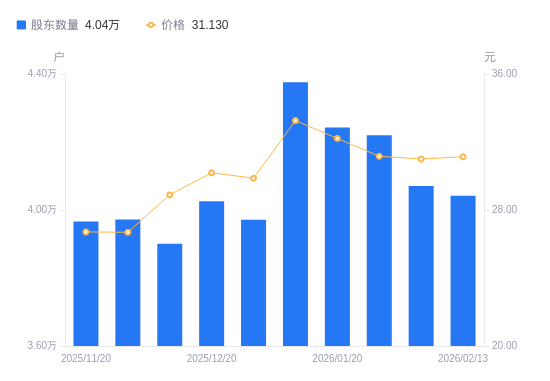 日期A股户数(户)流通A股户均持股数(股)户均持股市值(万元)2026-02-134041824196.3875.322026-02-104070324026.9574.482026-01-314219823175.7272.222026-01-204242523051.7274.252026-01-104375722350.0074.342025-12-313971124627.1673.562025-12-204025424295.6273.352025-12-103900825071.6772.432025-11-303972424611.7265.692025-11-203966424648.9365.84