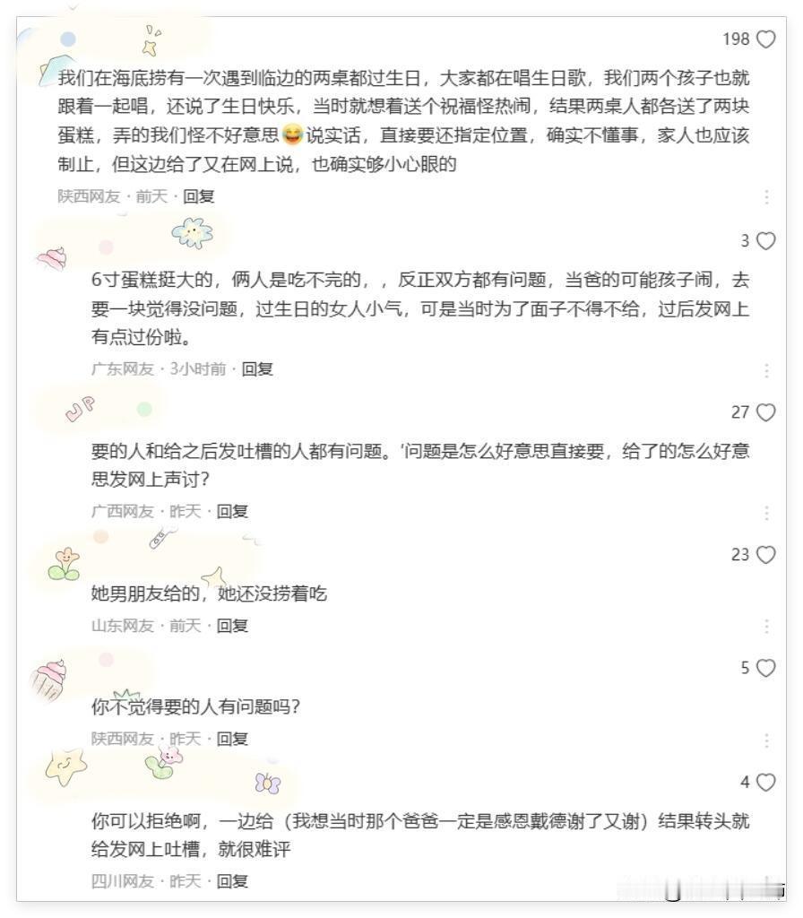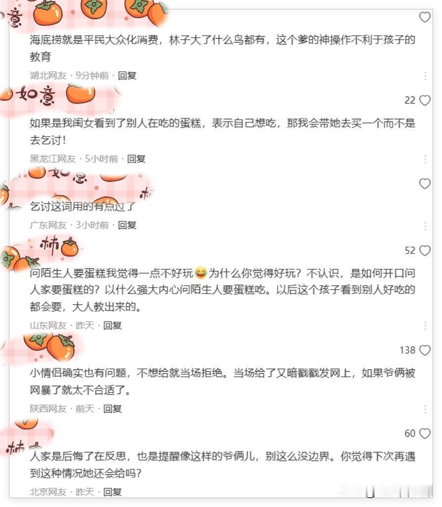 说句实在话,能带着孩子去海底捞吃饭,光是锅底和餐位费加起来,都完全够给孩子在旁边便利店买一块小蛋糕了。既然消费得起,又何至于让孩子去跟陌生人“讨”那一口呢?