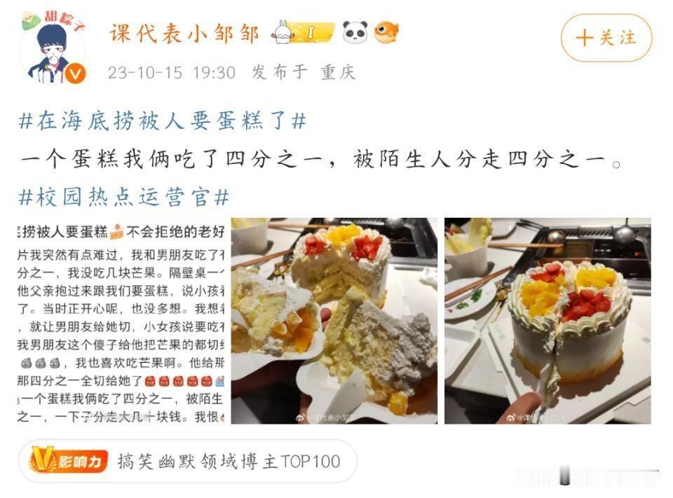 事情很简单:一对情侣在过生日,邻桌一位爸爸带着女儿过来,希望能分一块蛋糕给小女孩,并且指定要带芒果的那部分。