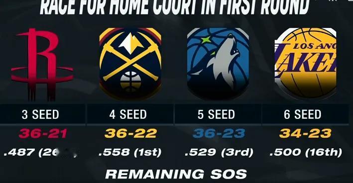 西部3-6名,剩余赛程难度: 第3:火箭,剩余对手48.7%,难度第26 第4:掘金,剩余对手55.8%,难度第1 第5:森林狼,剩余对手52.9%,难度第3 第6:湖人,剩余对手50%,难度第16 从火箭的角度出发,只要正常发挥,基本可以稳得住西部第3的位置,他们的对手就是西部第6,湖人、森林狼、掘金里面挑一个。 而第7的太阳近期遭遇了一些伤病,勇士也一样,这两个队想直通季后赛,需要自己赢球和前面队伍掉链子,想要翻盘上来的难度很大。 因此西部如今的第3-第6,季后赛大概率会捉对厮杀,这里面,湖人是最弱的那一支,没有挑对手的资格,首轮若是能赢两场,就算赚到了。
