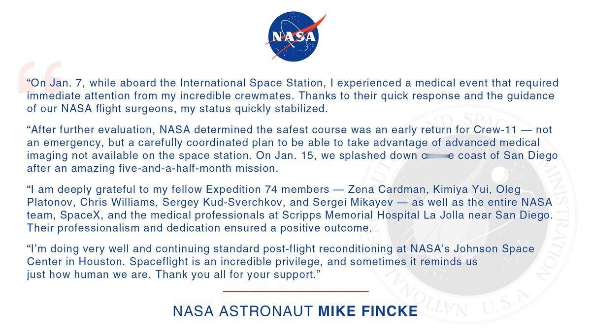 NASA宇航员迈克·芬克(Mike Fincke)公开分享了他在国际空间站(ISS)上发生的一次医疗事件个人经历,该事件导致整个Crew-11任务提前结束。这标志着NASA历史上首次从国际空间站进行医疗撤离。