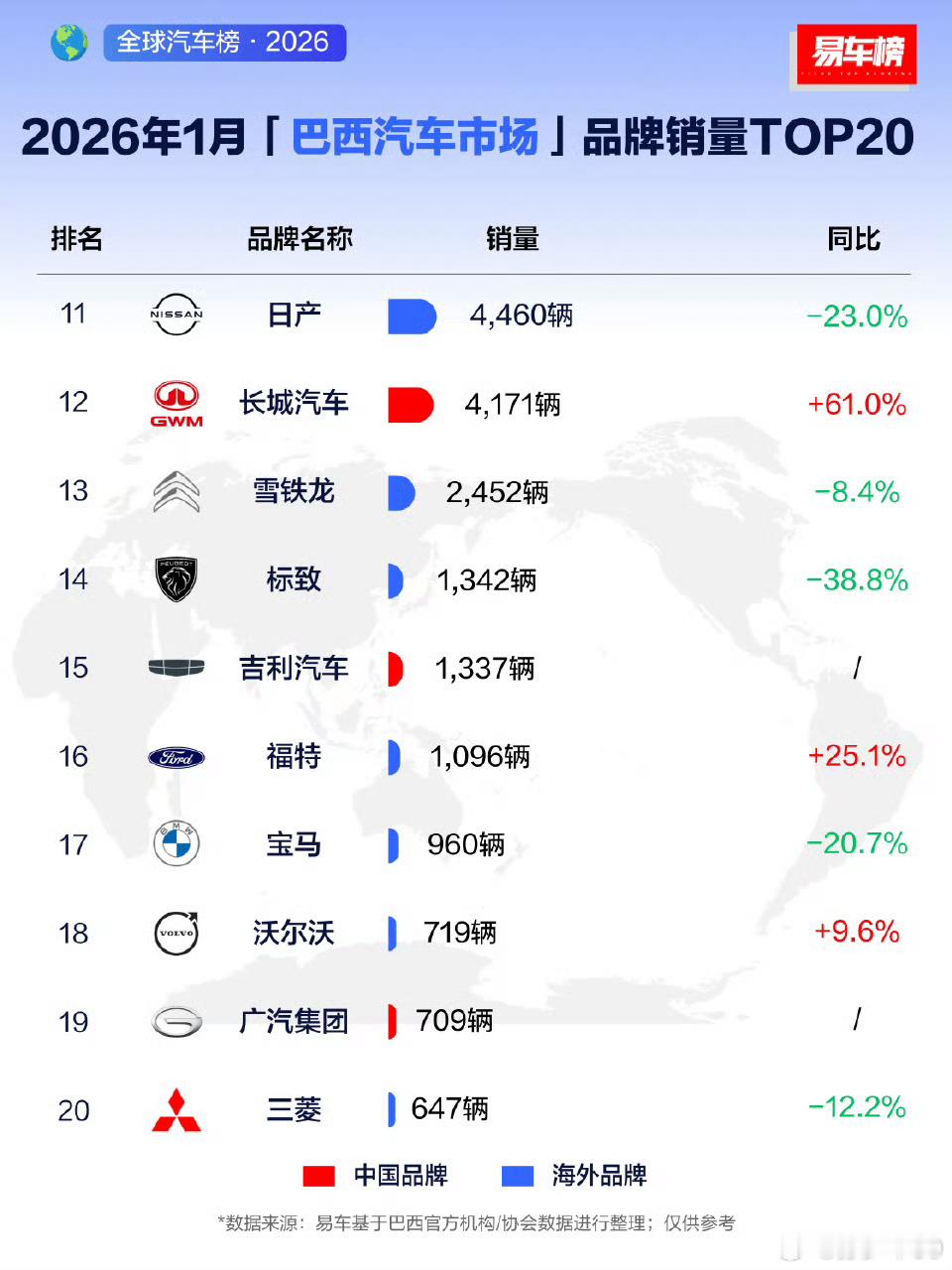 1月巴西新车销量排行榜第一是大众,5家国产品牌上榜,其中比亚迪排第五,奇瑞第10