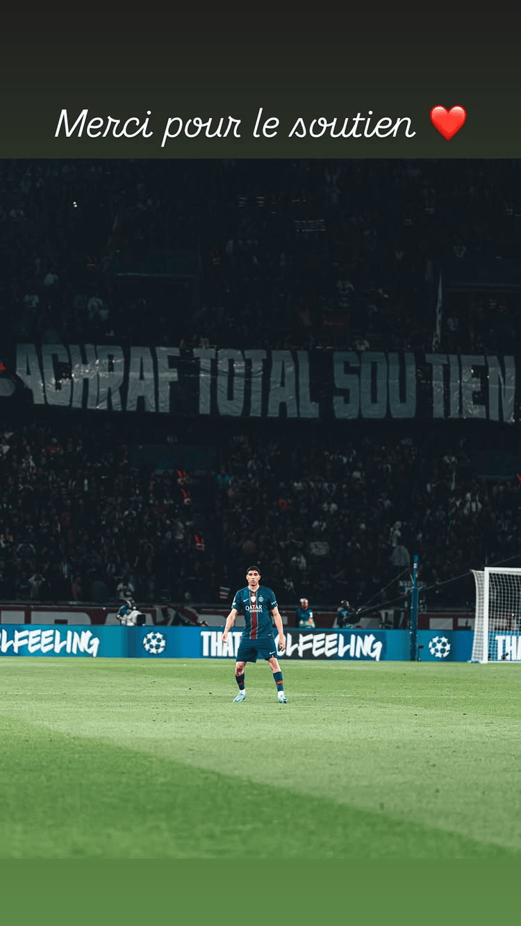 赛后,阿什拉夫更新了Instagram,发布了他在赛场上的照片,身后是球迷打出声援他的标语。阿什拉夫在Ins中写道:感谢你们的支持。