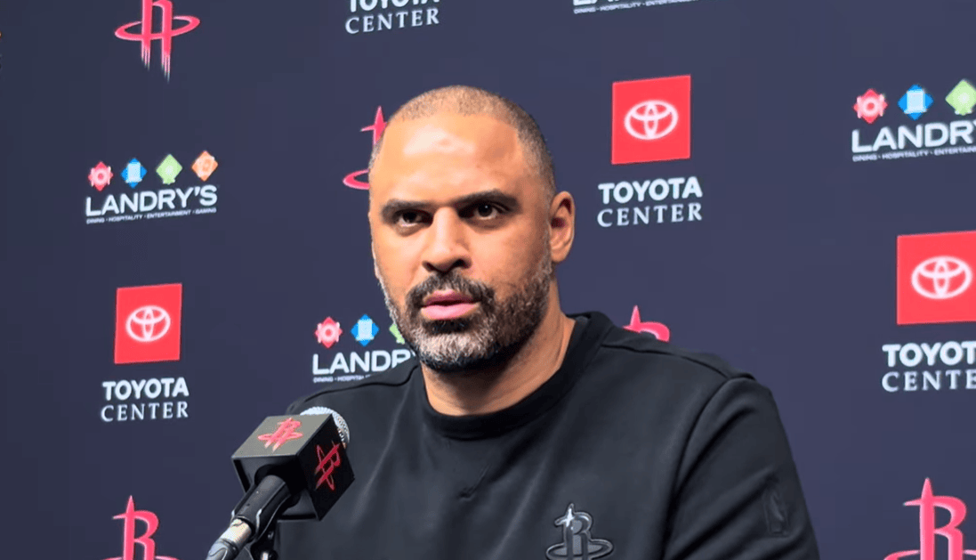 乌度卡:这会拉开空间,这是他的比赛方式,是他的一部分。我们有三个非常不同的挡拆持球人。他带来了一些范弗利特上赛季带来的东西——对手不会像对杜兰特那样疯狂夹击他,所以他有更多空间去操作。如果我们设好掩护,他把防守人摆好位置,他可以直接走进三分线出手。我们希望他每次都敢投。他的无球移动很好,队友也在找他,尤其是二次进攻和外线回传。他是一个巨大的空间威胁,从对手给他的防守规格就能看出来。