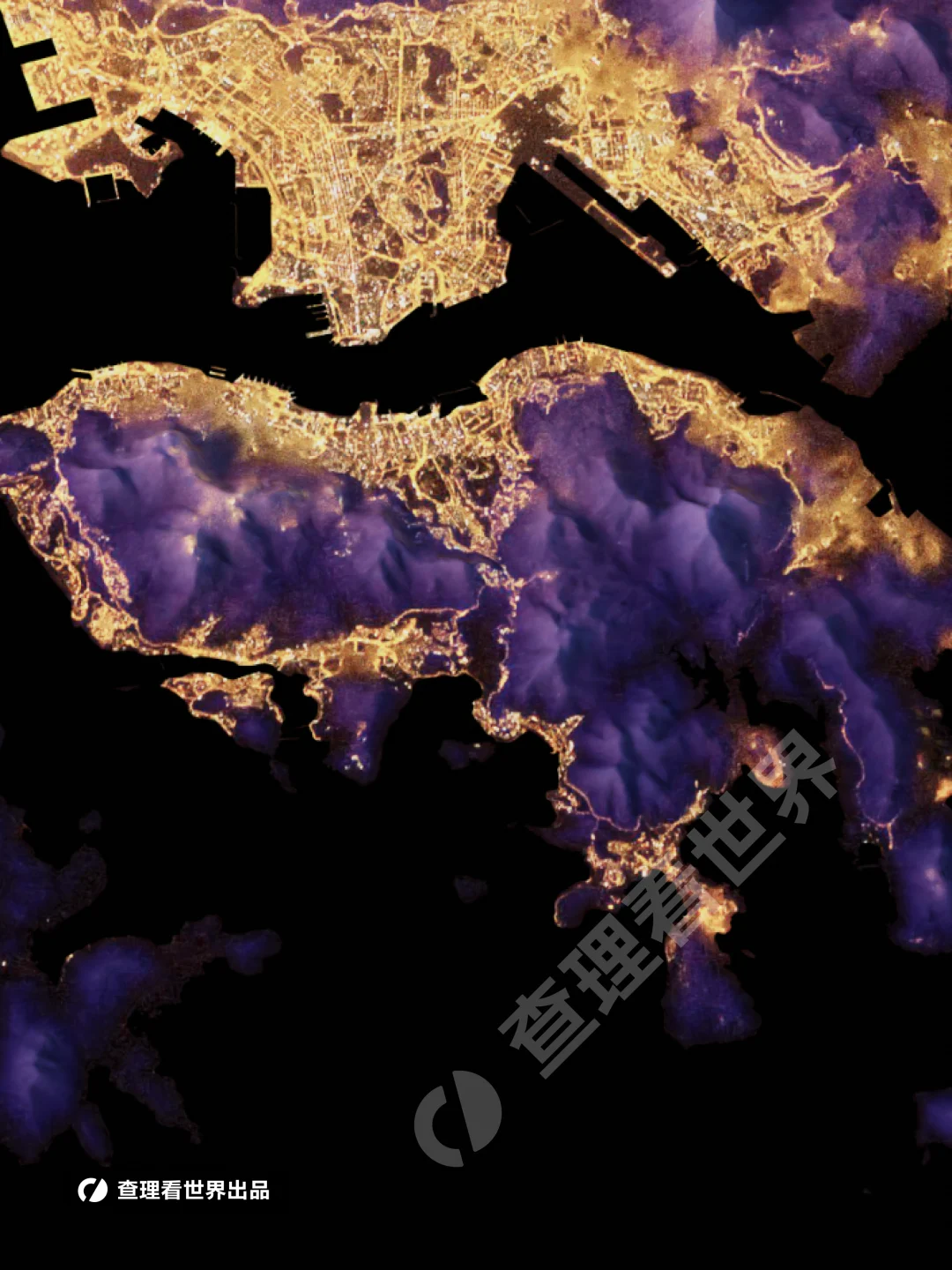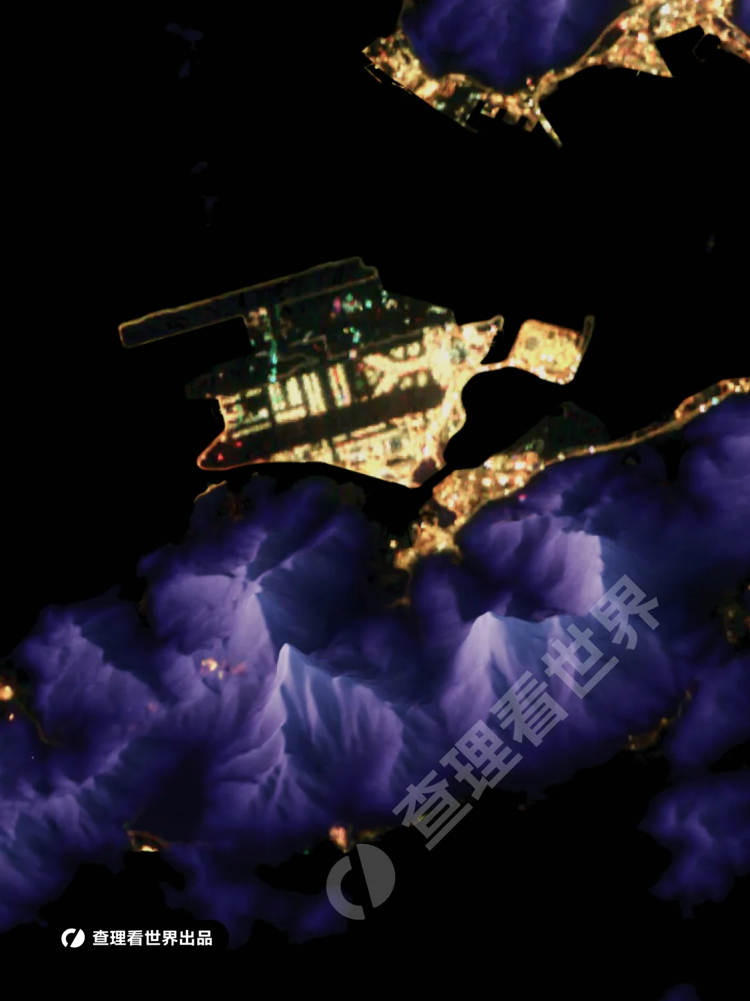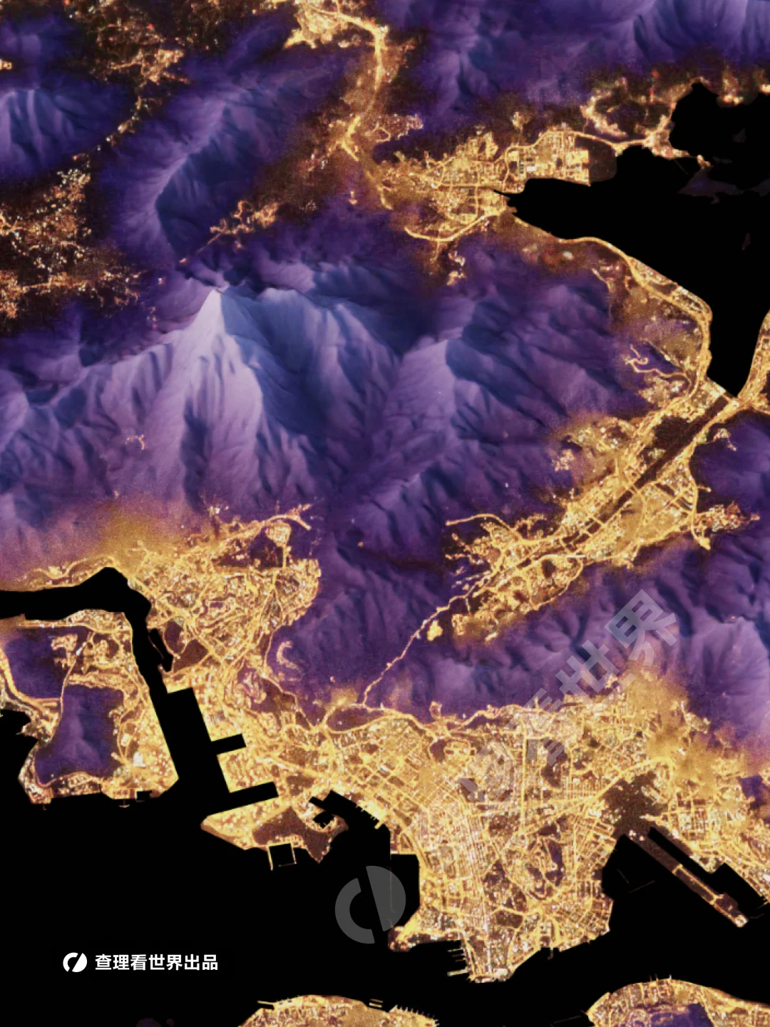 我们可以看到香港灯光最璀璨的区域集中在维多利亚港两岸。由于九龙半岛和香港岛北岸平原狭窄,形成了全球最密集的摩天大楼群。 地图中深紫色的阴影区域是错综复杂的山脉,如大帽山、狮子山和太平山。这些山体占据了全港约 70% 的面积,不仅是城市的天然屏障,也让香港拥有了高比例的郊野公园,形成了“入则繁华,出则自然”的奇观。在光亮的边缘,可以观察到人工填海带来的规整线条,特别是西面的香港国际机场(赤鱲角)和东涌新市镇。 这张地图生动地展示了香港“山多平地少”的独特地理格局。通过夜间灯光与地形起伏的交织,我们可以清晰地观察到城市发展如何受制于自然地貌。