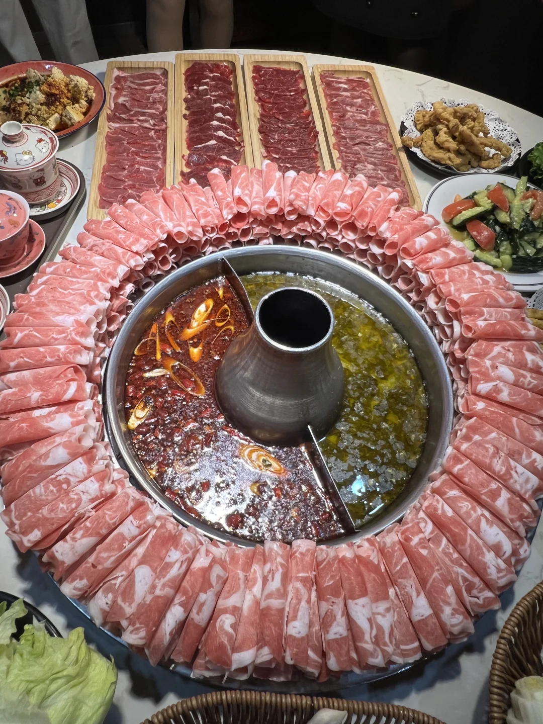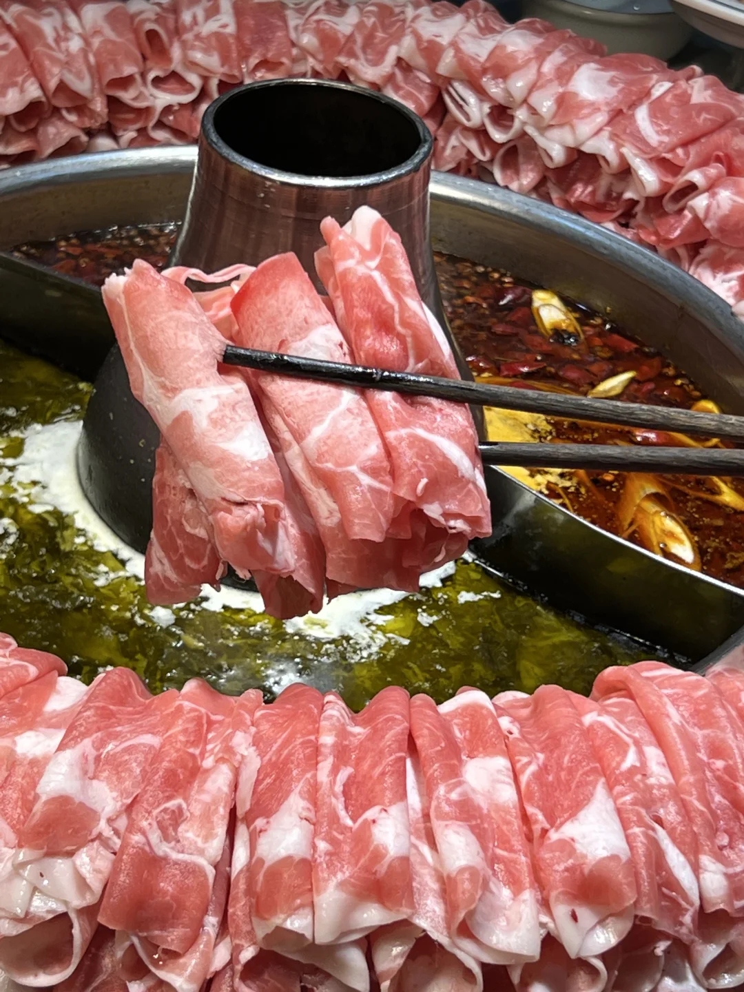 一边是老坛酸菜锅,酸辣直冲天灵盖,煮菜自带鲜味儿,裹上芝麻酱很🆕香