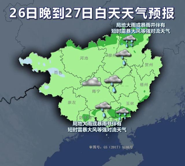 梧州气象部门预计,未来几天,梧州市多阴雨天气,局地雨势较强并伴短时雷暴大风等强对流天气,具体预报如下: