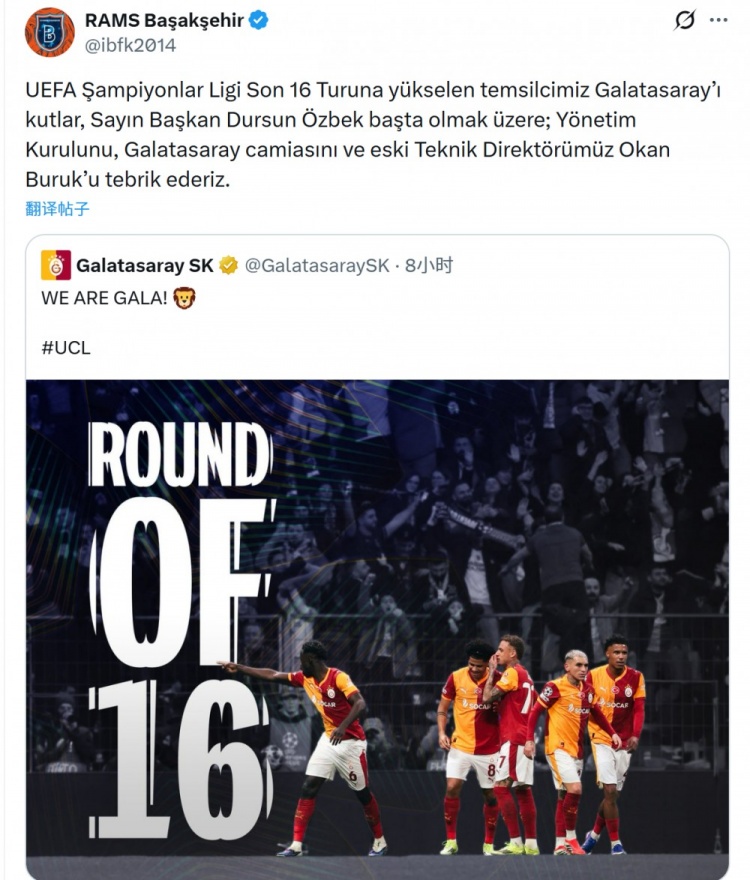 土耳其俱乐部伊斯坦布尔官方社媒转发加拉塔萨雷的晋级海报,对加拉塔萨雷表示祝贺。