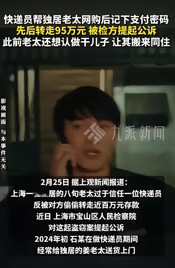 自作孽,不可活! 上海一位老太太姓姜,现年80多岁,丈夫去世后,自己一人独自生活。一位快递小哥石某,上门送货时,经常帮助她,有时给她搬桶水,有时给她修阀门,有时帮忙带走垃圾。 时间久了,俩人处的就跟亲人一样了,姜奶奶觉得这小伙子真不错,就经常给姜某小费零钱啥的,并在内心打定了主意,找了个合适的时机,认他做了干儿子!姜老太有两套房子,她告诉石某,让他随时可以搬进来,方便以后好好照顾自己。 姜奶奶年纪大了,老眼昏花。有一次,石某来送货,江奶奶因为看不清,就让他帮自己输入了支付密码,石某因此记住了转账密码。 最初的时候,他也没动什么坏心思,可他迷上了打赏女主播,非常享受当榜一大哥的感觉,还为对方买了好多东西,为此不惜借了高利贷! 当高利贷逼债的时候,石某走投无路,便有了歪主意。他趁着姜老太又一次让他帮忙网购支付的时候,偷偷扫了自己的收款码,但数额较小,只是为了试探。 没想到姜老太根本没发现,让他欣喜若狂,紧接着如法炮制,多次转账,从几千元到几万元,陆续转走了老太太很多钱。这些钱都被他用来还债、消费和打赏了女主播! 姜老太终于发现自己的钱变少了,就报了警,石某做贼心虚,赶紧转回去了一些,把老太太糊弄了过去! 他紧接着发现,姜老太的账户上还有二三十万,这让他欲罢不能,就编了个理由,说要帮她调一调网速,拿到手机后,疯狂转款,两天时间就转走了9万多!经过警察调查,石某前后转走了姜老太95万余元,姜老太却始终把它当做最信任的人! 其实,只要石某坚持几年,尽心尽力的照顾姜老太,最后钱和房子都是他的,因为在姜老太的内心,已经将石某当做了最近的亲人和最大的依靠! 君子爱财,取之有道!但石某却被贪欲蒙了心,辜负了老太太的好意,也触犯了法律,最后落得个两手空空,还要为此坐牢,这又何必呢?