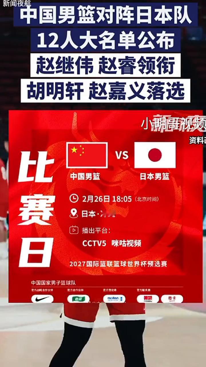 中国男篮对阵日本队,12人大名单公布,赵继伟、赵睿领衔,胡明轩、赵嘉义落选。 2月25日(发布),北京时间2月26日18:05,中国男篮将在世预赛第二窗口期的比赛中客场挑战日本男篮。前技术会上中国男篮提交了本场比赛的12人名,赵继伟、赵睿、廖三宁、高诗岩、贺希宁、李弘权、朱俊龙、王浩然、胡金秋、焦泊乔、张镇麟、余嘉豪。 相较于此前的14人名单,胡明轩、赵嘉义两人落选。日本男篮官方也公布了12人大名单,归化球员霍金森缺席,另一位归化球员科克入围大名。科克效力于B联赛琉球黄金帝王,次日本男篮的主帅桶谷大正是琉球黄金帝王的主帅。