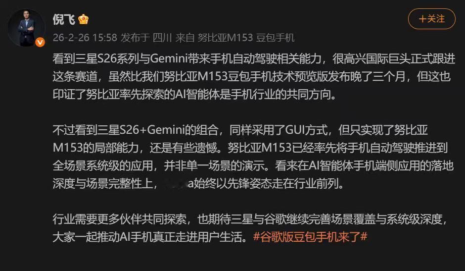 努比亚总裁倪飞回应谷歌版豆包手机三星S26系列携手Gemini推出手机端智能体相关能力,说明消费者AI终端赛道也有越来越多的巨头入局,同时也印证了努比亚率先探索的AI智能体方向已成为行业共识与未来趋势。尽管该方案比努比亚M153豆包手机技术预览版晚发布三个月,却进一步凸显了努比亚的前瞻布局与引领价值。对比来看,三星S26目前仅实现部分能力落地,而努比亚M153早已将手机自动驾驶推进至全场景、系统级应用,而非单一场景演示,在AI智能体端侧落地深度、场景完整性与系统整合能力上,努比亚始终以先锋姿态走在行业前列。我们相信,行业进步需要更多伙伴同行,期待三星与谷歌持续深化技术与场景布局,与努比亚共同推动AI手机从概念走向实用,让真正的智能体实际走进每一位用户生活。倪飞称豆包手机领先三星谷歌组合