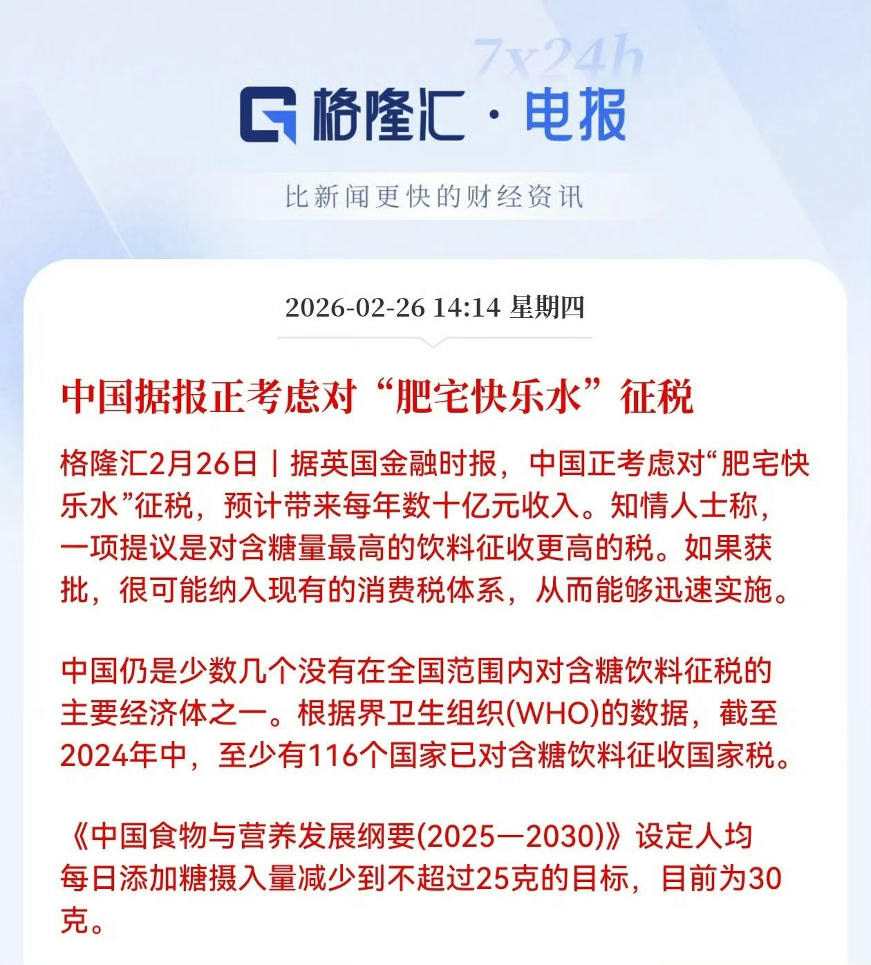 英国金融时报: 中国正考虑对“肥宅快乐水”征税,预计带来每年数十亿元收入。