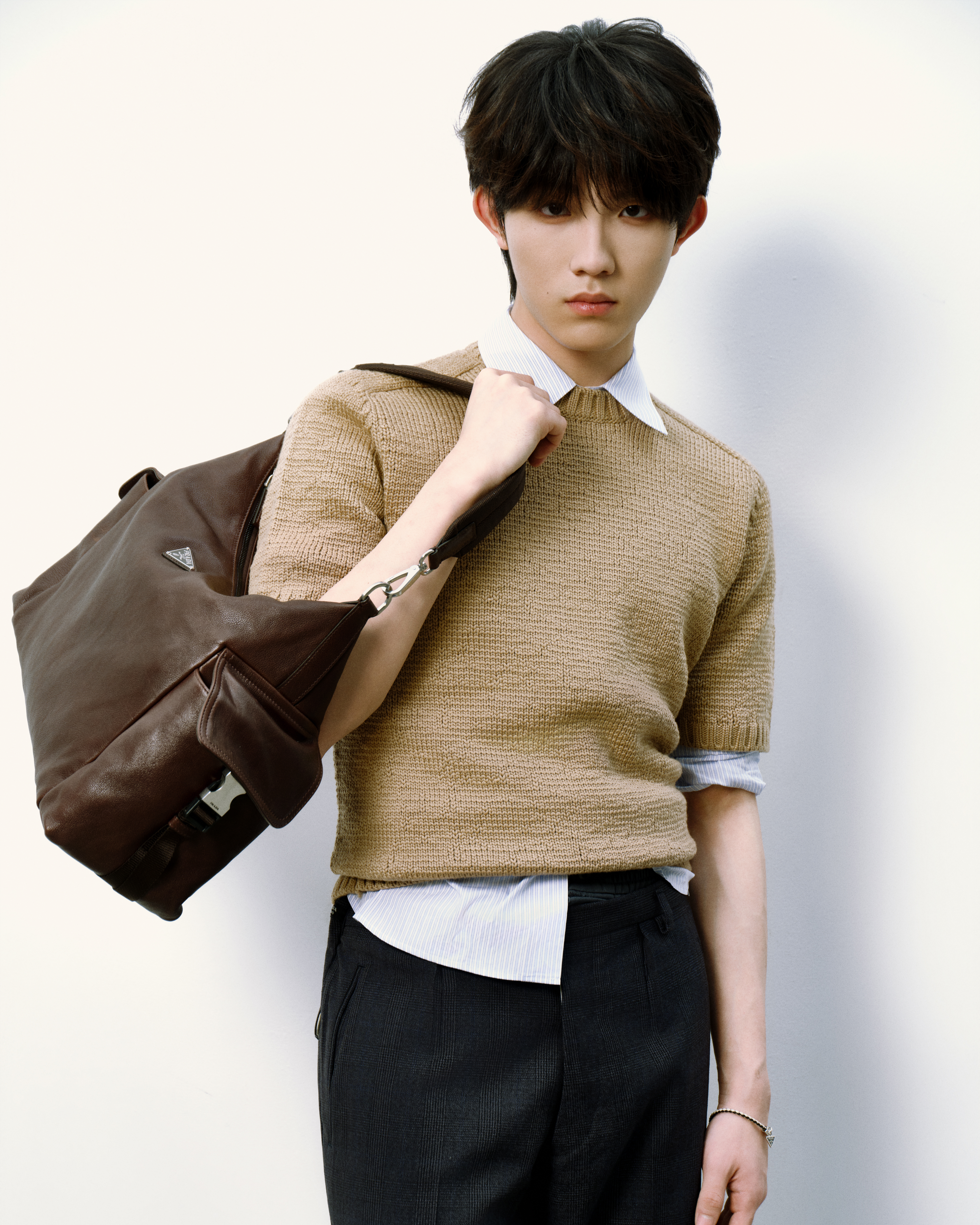 1️⃣ Prada 棉质衬衫2️⃣ Prada 短袖圆领毛衣3️⃣ Prada 羊毛长裤4️⃣ Prada Explore 系列牛皮单肩包5️⃣ Prada Chocolate亮面皮革乐福鞋