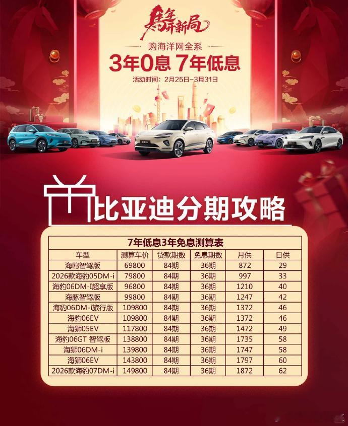 比亚迪海洋网全系3年超长免息 7年超长低息,从2月25日开始,3月31日截止。包括比亚迪海洋网旗下的海豹、海狮、海豚、海鸥等多个系列。