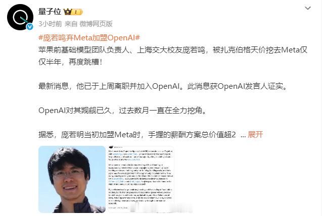 🔹 同时,国际知名 AI 研究员 庞若鸣(Ruoming Pang) 也从 Meta 转投 OpenAI。据外媒报道,他曾带领 Meta “超级智能实验室”的 AI 基础设施建设,在被 Meta 以高薪挖来后不到一年,再度被 OpenAI 招募。