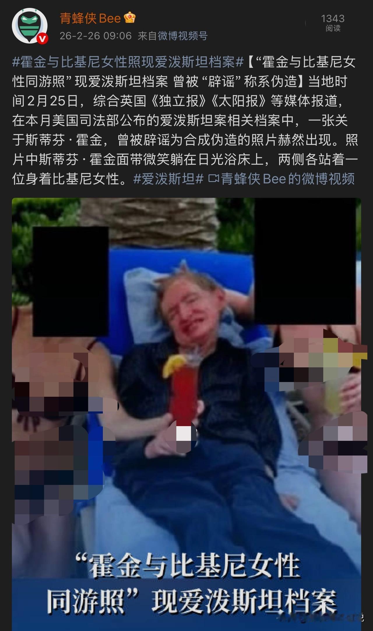 反转还是来了,霍金大神这是一生威名要毁于一旦的感觉,死后都不得安生啊!还记得之前爱泼斯坦案刚刚爆发那会儿,就曾经有网友盛传霍金曾是爱泼斯坦的常客,但这些都没有得到正式渠道的认可,有些甚至还被辟过谣。但反转最终还是在昨天来了,据英国《独立报》和《太阳报》等媒体报道,之前曾经辟过谣的一张霍金与两位比基尼美女的合照,现在却堂而皇之地出现在美国司法部公布的爱泼斯坦档案中。这张照片此前之所以很多人认为是谣言,主要是因为看起来的确像是P图,主要霍金的头部和躯体衔接有点不自然。但现在回头想想,本来霍金身体就异于常人,看起来不自然也是情有可原。这下可好了,霍金大神的棺材板恐怕是按不住了。但不管怎么说,现在爱泼斯坦案太过复杂,真真假假、利益纠葛、反转反转再反转都是有可能的。我等吃瓜群众最好就是谨慎吃瓜,且看且欢乐!