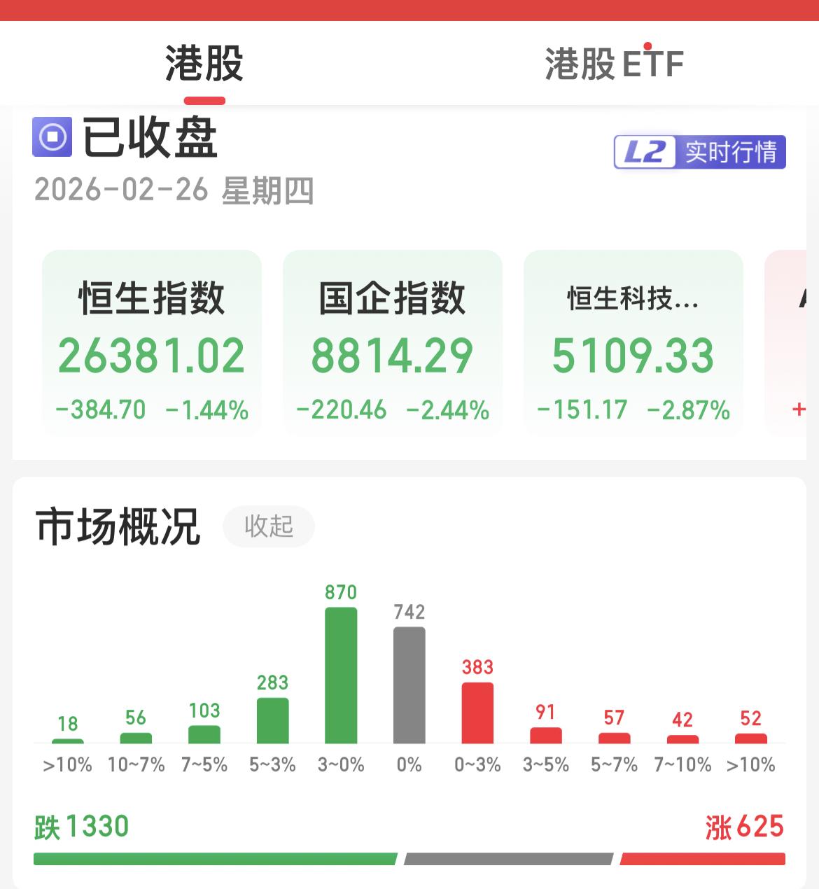 港股大跌敲响警钟:A股开门红后,更需理性守稳。 …………………………………… 今日港股三大指数全线走弱,恒生指数收报26381.02点,下跌1.44%,短线形态偏弱;恒生科技指数跌幅达2.87%,呈现破位下行态势,市场情绪明显降温。 板块层面,金融与科技两大核心权重同步调整,中国平安港股大跌4.64%,成为指数主要拖累,阿里巴巴、美团等科技龙头亦集体走弱,进一步放大了市场的谨慎氛围。 ……………………………………… 港股的调整,并非孤立行情。作为与A股联动紧密的市场,其资金流向与情绪波动,往往会形成跨市场传导。 在昨晚外围上涨的情况下,今日A股明显放量滞涨,资金净流出,下跌家数多于上涨家数,盘面分化加剧。 当前A股短线积累了一定获利盘,本身存在自然消化的需求,叠加港股的外围扰动,短期回调压力有所上升。 两地上市的核心资产,更会成为情绪传导的纽带,即便A股当日表现相对韧性,也难以完全隔绝外围波动的影响。 ……………………………………. 投资路上,涨时不骄、跌时不慌,才是长久之道。 面对港股传递的风险信号,我们不必过度恐慌,更无需盲目跟风,而是以更稳健的节奏应对行情:合理控制仓位,严守风控底线,保留充足的流动性,耐心等待情绪企稳、方向明朗。 节后开门红的喜悦值得珍惜,风险的警示更需重视。 守住心态、管好仓位,在波动中保持理性,才能在市场的起伏里,稳稳握住属于自己的收益。 ……………………………………