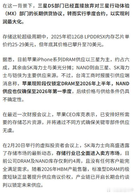 在此之前,苹果一直凭着自己的市场地位以相对较低的价格采购LPDDR,随着存储短缺加剧,如今连苹果都直接一口接受100%涨幅,这足以说明当前各手机厂商对存储芯片库存争夺的激烈程度。 存储全面进入卖方市场:三星100%“试探性涨幅”获苹果照单全收