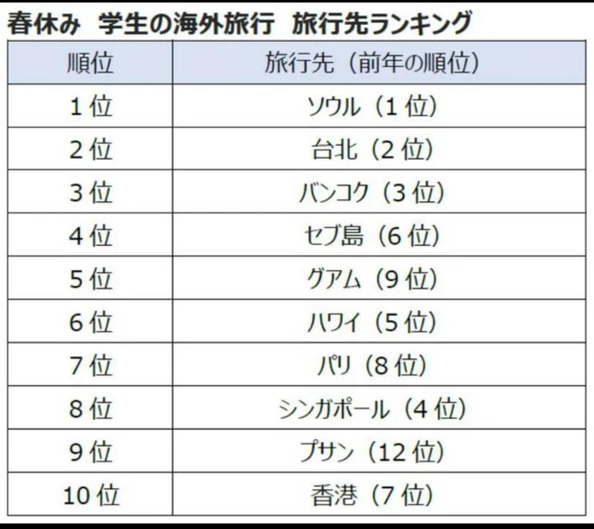 近日,日本大型旅行社H.I.S.根据2、3月份的预订情况,公布了旅行目的地排行榜。排名与去年相同,依次为首尔、台北和曼谷。 该公司表示:"春假期间学生群体的海外旅行预订人数与前年基本持平,趋势稳定。" 并总结称:"包含燃油附加费、出入境税等各类税费在内的人均平均花费为147,000日元,是前年的107.1%。受物价上涨及日元贬值等因素影响,旅游费用呈上升趋势。"