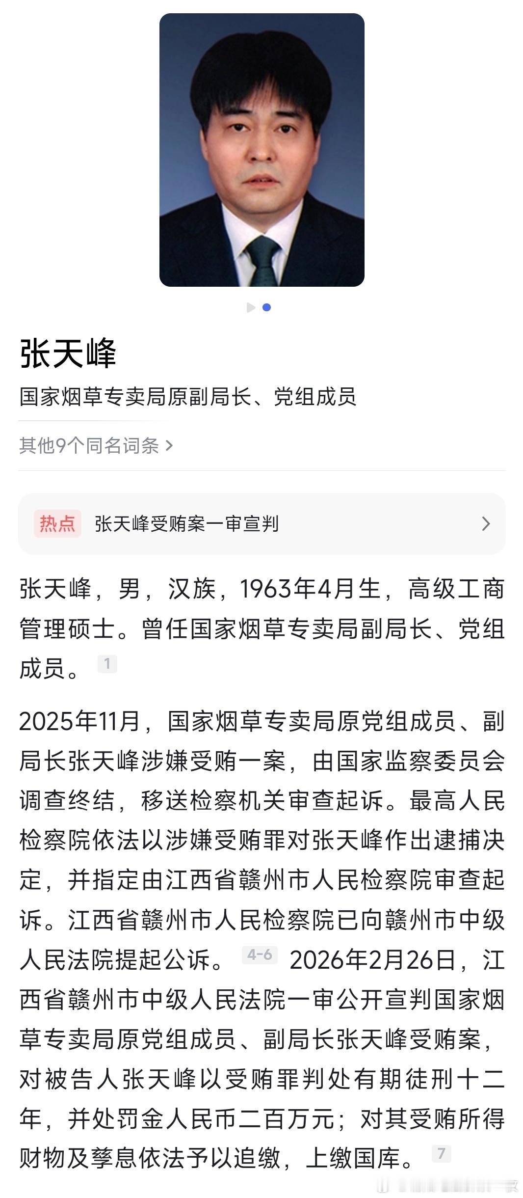 国家烟草专卖局原副局长被判12年国家烟草专卖局原党组成员、副局长张天峰,一审获刑十二年。