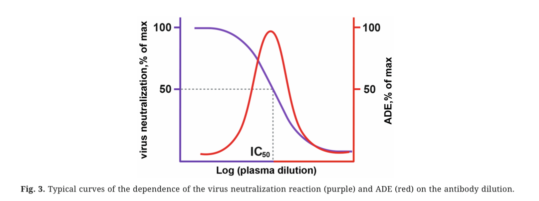 这种浓度依赖的特点,体现在曲线中就是中和反应的S型曲线,和ADE的钟型曲线。ADE效应最强的抗体浓度,恰好接近病毒50%中和浓度(IC50),稍高或稍低,ADE的作用都会减弱,这种微妙的浓度平衡,让体内的ADE发生更难预测。