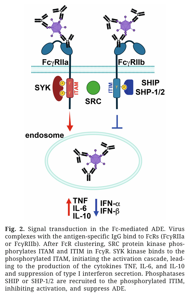 参与ADE的Fc受体主要有四种:FcRI、FcRIIa、FcRIIb、FcRIIIa,前三者和FcRIIIa的胞内段,分别带有ITAM激活基序和ITIM抑制基序,这两个基序就是调控ADE的“油门”和“刹车”。ITAM被激活会启动下游信号,ITIM则会抑制这一过程,两者的平衡直接决定ADE是否发生。