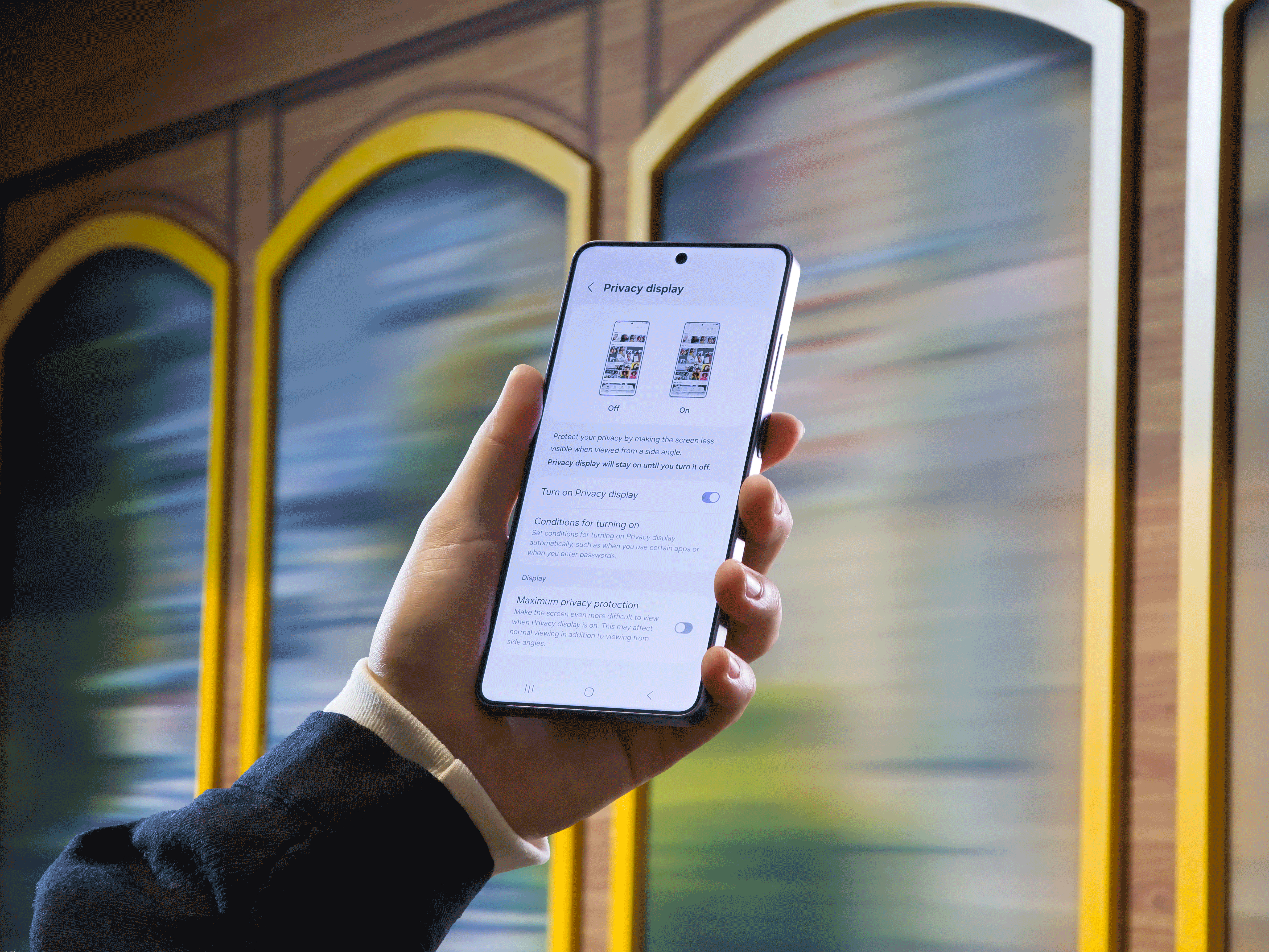 开启也很直接,支持手动/自动模式。地铁刷聊天、咖啡馆付款、会议室看文档,侧面视角几乎瞬间衰减,没有明显延迟。