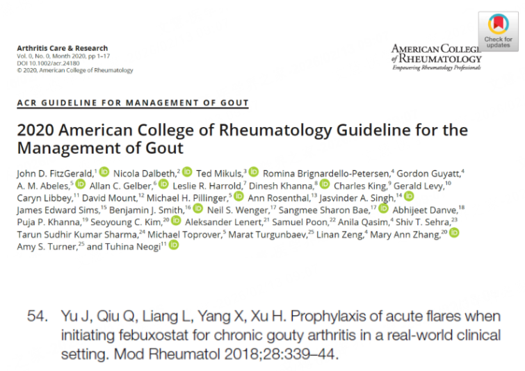 2020版ACR(美国风湿病学会)痛风临床实践指南引用余金泉及团队的研究成果