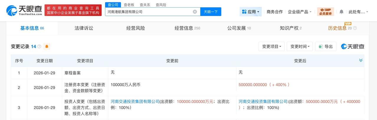 河南港航集团增资至50亿 增幅400% 天眼查App显示,近日,河南港航集团有限公司发生工商变更,注册资本由10亿人民币增至50亿人民币,增幅400%。 该公司成立于2024年6月,法定代表人为吕维前,经营范围含港口经营、建设工程施工、国际道路货物运输、道路货物运输、国营贸易管理货物的进出口、水路普通货物运输、港口理货、船舶港口服务、装卸搬运等,由河南交通投资集团有限公司全资持股。 天眼查信息: