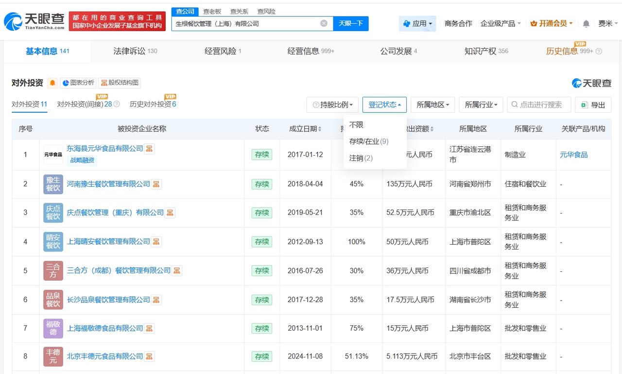 一点点奶茶商业版图盘点 一点点奶茶对外投资11家企业一点点 近日,奶茶品牌“一点点”因资助对象筛选标准引发公益信任危机,受助男孩佩戴高价手表、获赠漫画书等细节触发消费者对其公益透明度的质疑。 天眼查App显示,一点点奶茶关联公司生根餐饮管理(上海)有限公司成立于2011年8月,法定代表人为楼更深,注册资本800万人民币,经营范围包括餐饮服务、信息技术咨询服务、市场营销策划等,由宏美控股有限公司全资持股。对外投资信息显示,该公司对外投资11家企业,其中9家企业处于存续状态,包括东海县元华食品有限公司、河南豫生餐饮管理有限公司等。 天眼查信息: