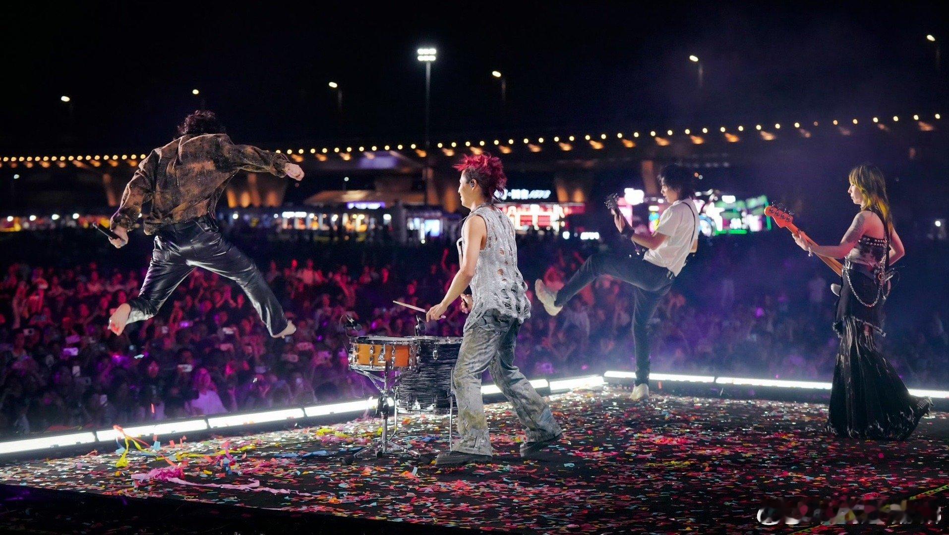 新裤子随地大小扭舞姿很曼妙 摇滚现场的集体蹦迪,新裤子玩得最明白。不拘束不端着,想扭就扭想晃就晃。彭磊扭得像喝了假酒,庞宽扭得像触电了,赵梦扭得又美又飒——关键是你看着看着,自己也想跟着扭起来。
