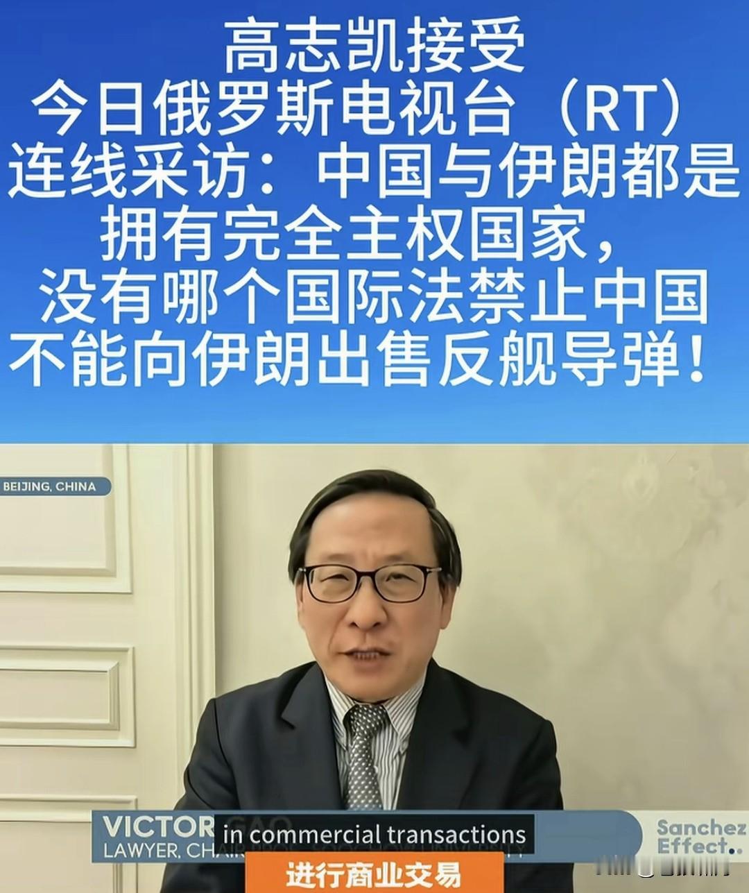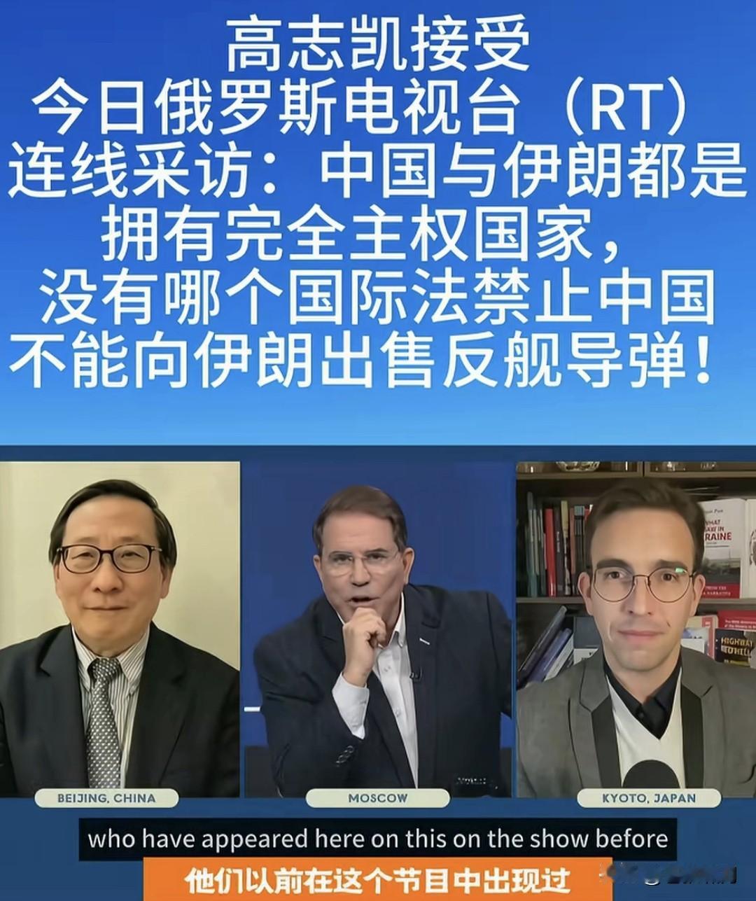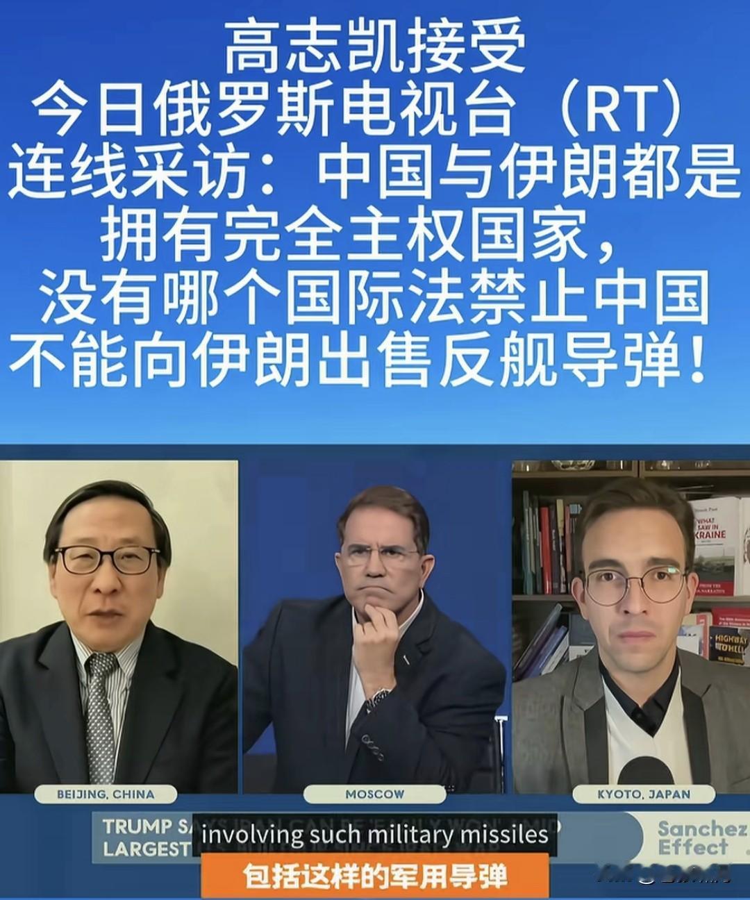 智库专家高志凯教授:中国与伊朗都是主权国家,没有哪个国家法规定:中国不能向伊朗出售反舰导弹! 这是高教授接受俄电视台连线采访,被问及“美以与西方国家,反对中国向伊朗反舰导弹,你怎么看”时,回答主持人的一番话!觉得不对味。 如果按照国际法,严格讲高教授如此回答,确实没问题!就像他所言,中伊都是主权国家,没有国际法规定限制,中伊不能进行上述相关贸易! 关键是此时此刻,老美正调兵遣将,海空围堵伊朗,欲使哈梅神权服软,同意美以条件,切断“哈真胡”援助,放弃核武研发,停止中程导弹生产之际,我们的一言一行,都应谨慎呐! 这个问题如同俄乌战争,美欧公开援乌资金武器,却不准其他国家援俄,出售武器弹药!这是赤裸裸的强权霸凌?还是强行要人站队:请与文明正义同行,不要与野蛮暴戾为伍呢? 苍狼觉得两件事情,有点雷同类似。按道理讲是一回事,该怎么做是另外一回事!既要遵守联合国宪章与国际法,还要看清世界文明野蛮力量对比,更要看如何对国家发展更有利! 也许是俄电视台主持人,故意设的套,让高教授表态?高教授以国际法说事,当然没问题!但俄主持人以“中国态度”宣扬,大概就不好了吧! 以上观点,仅是个人看法!若有不妥,请网友批评。也欢迎大家讨论,当前世界乱局,如何泰然处之呢? …………