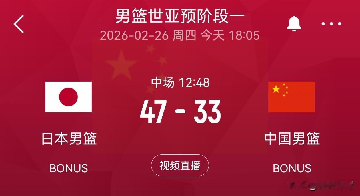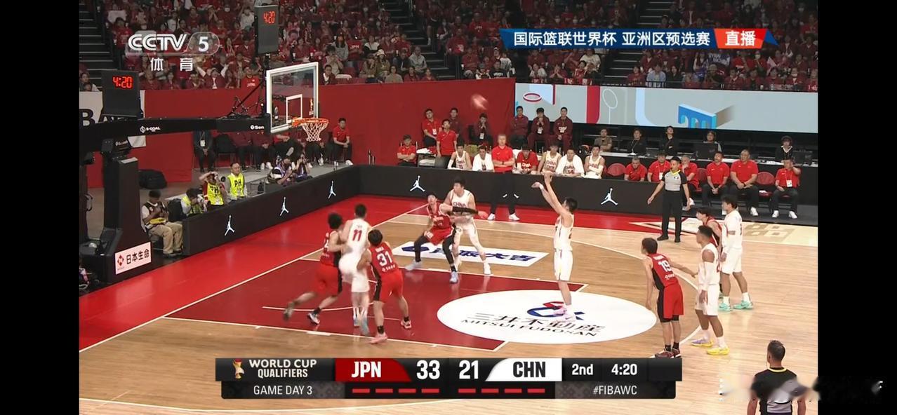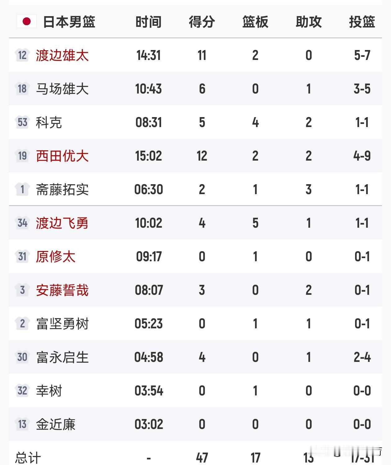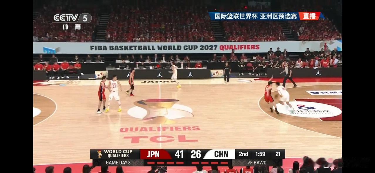 半场比赛结束中国男篮赵睿,廖三宁各得8分,胡金秋6分,贺希宁4分,李弘权3分,朱俊龙,王浩然各得2分,上半场中国男篮10人轮换,8人得分,没有得分的是赵继伟出战5分钟,贡献1篮板1抢断的数据,同时有2次失误2个犯规,再有一个张镇麟出战8分钟得到0分1个犯规,中国男篮首节11-21落后日本10分,第二节中国男篮22-26单节落后4分,半场比赛结束中国男篮以33-47落后对手14分,中国男篮还是老问题终结能力严重不足,半场比赛30投仅11中,投篮命中率仅有33%,同时半场就出现了7次失误,如果下半场不能够提升命中率,那么本场比赛很难取胜,反观日本男篮上半场就有两人得分上双。