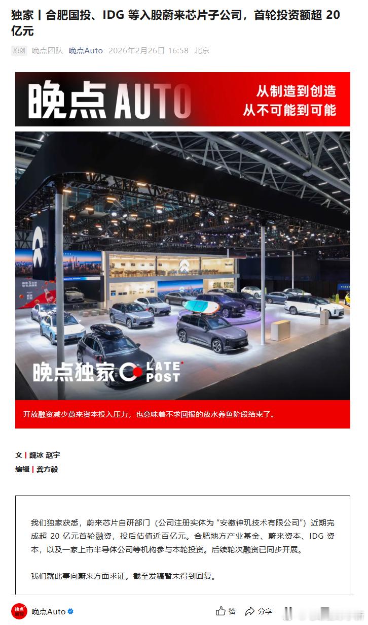 蔚来芯片子公司安徽神玑完成超 20 亿元首轮融资投后估值接近百亿元,合肥国投、I