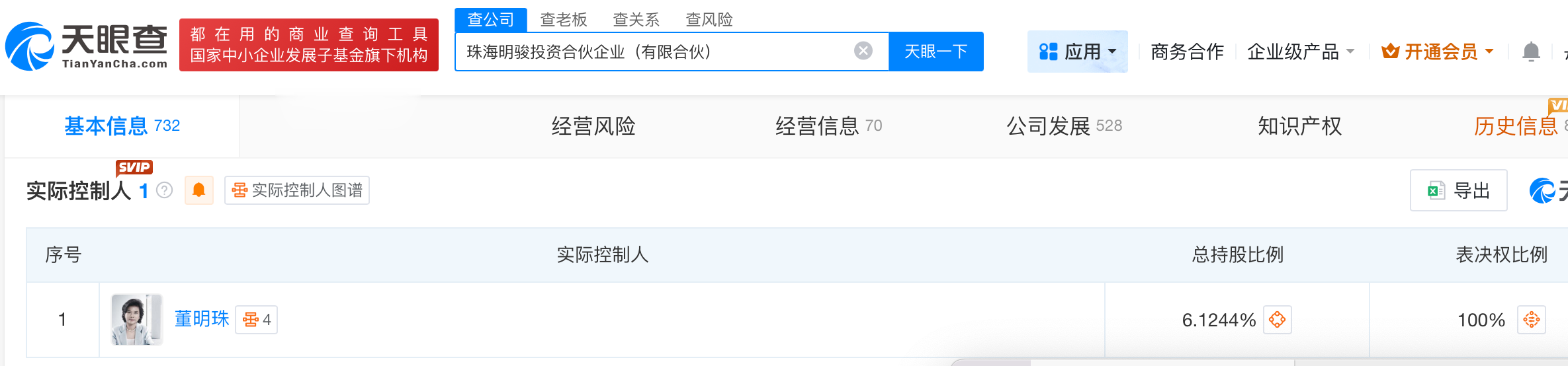 天眼查信息显示,珠海明骏投资合伙企业(有限合伙)成立于2017年5月11日,经营范围为股权投资。其对外投资仅有珠海格力电器股份有限公司。值得注意的是,在珠海明骏的复杂股权架构中,董明珠实际控制的珠海格臻投资管理合伙企业(有限合伙)占有重要席位,这使得董明珠对珠海明骏的决策具有重大影响力。珠海明骏投资合伙企业(有限合伙)的实际控制人为董明珠。